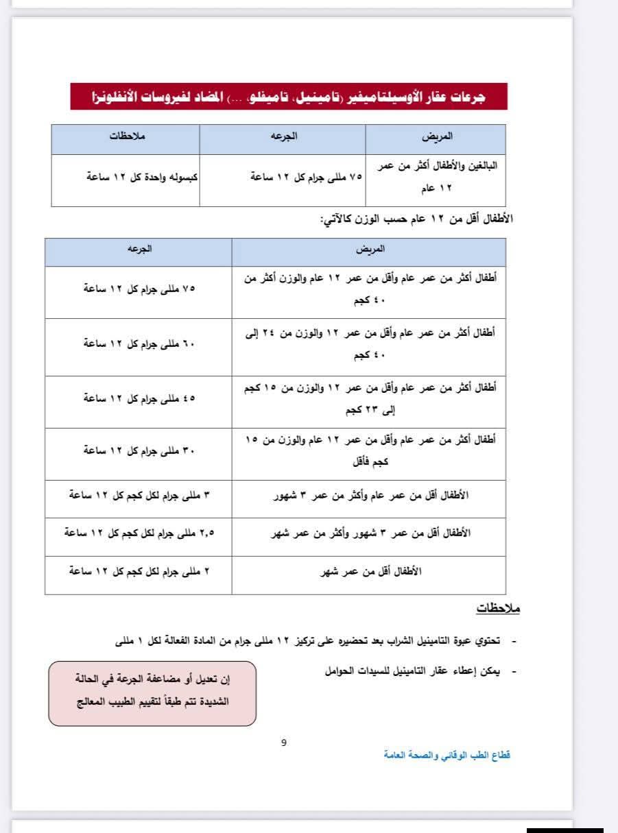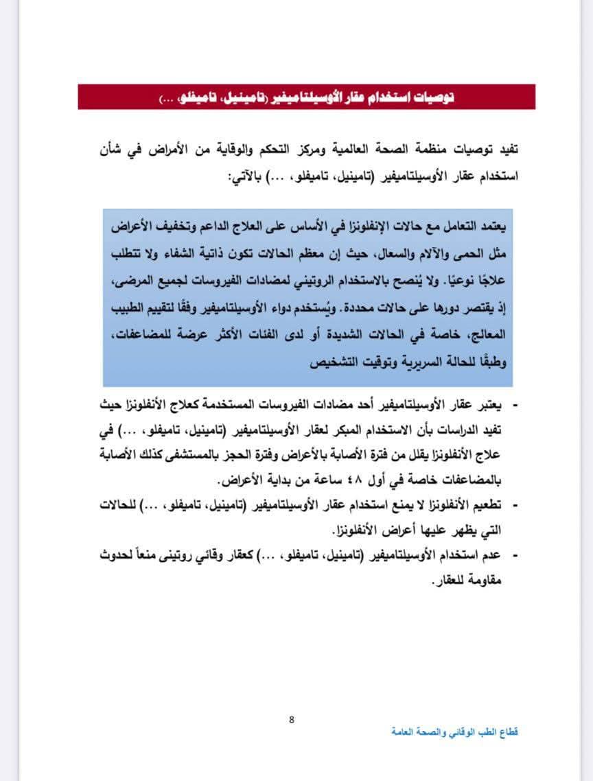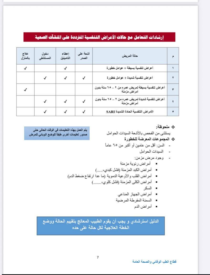 وشددت وزارة الصحة على أن هذا الدليل استرشادي، ويقع على عاتق الطبيب المعالج تقييم كل حالة على حدة ووضع الخطة العلاجية المناسبة وفق الحالة الإكلينيكية، مع الالتزام بالتحديثات الصادرة بحسب الوضع الوبائي.