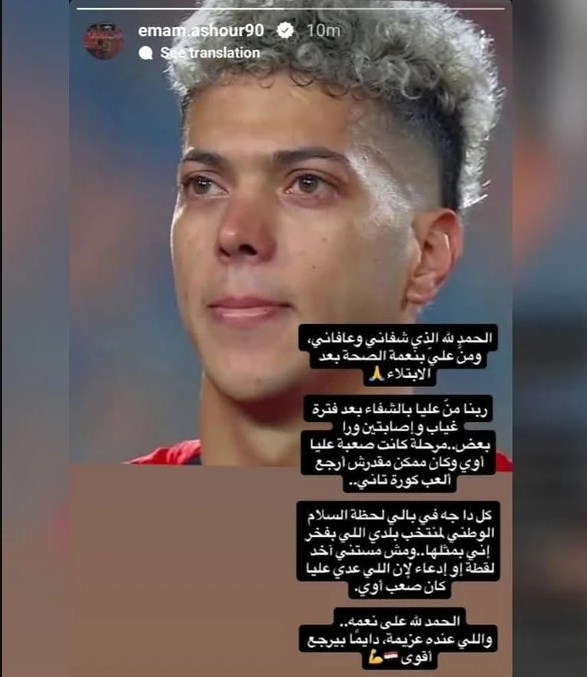 وجَّه نجم الكرة المصرية إمام عاشور، لاعب النادي الأهلي ومنتخب مصر، رسالة إنسانية مؤثرة عبر خاصية «الإستوري» على حسابه الرسمي بموقع إنستجرام، عقب تعافيه من الإصابة وعودته للمشاركة مع المنتخب الوطني.
