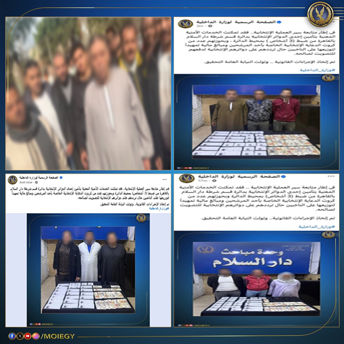 وفى سياق آخر، رصدت وزارة الداخلية فيديو تم تداوله بمواقع التواصل الاجتماعى تضمن قيام (أحد الأشخاص) بمحيط إحدى الدوائر الانتخابية بدائرة مركز شرطة السادات بالمنوفية بجمع عدد من البطاقات الشخصية الخاصة ببعض المواطنين وتوزيع مبالغ مالية عليهم لدفعهم للتصويت لصالح أحد المرشحين.