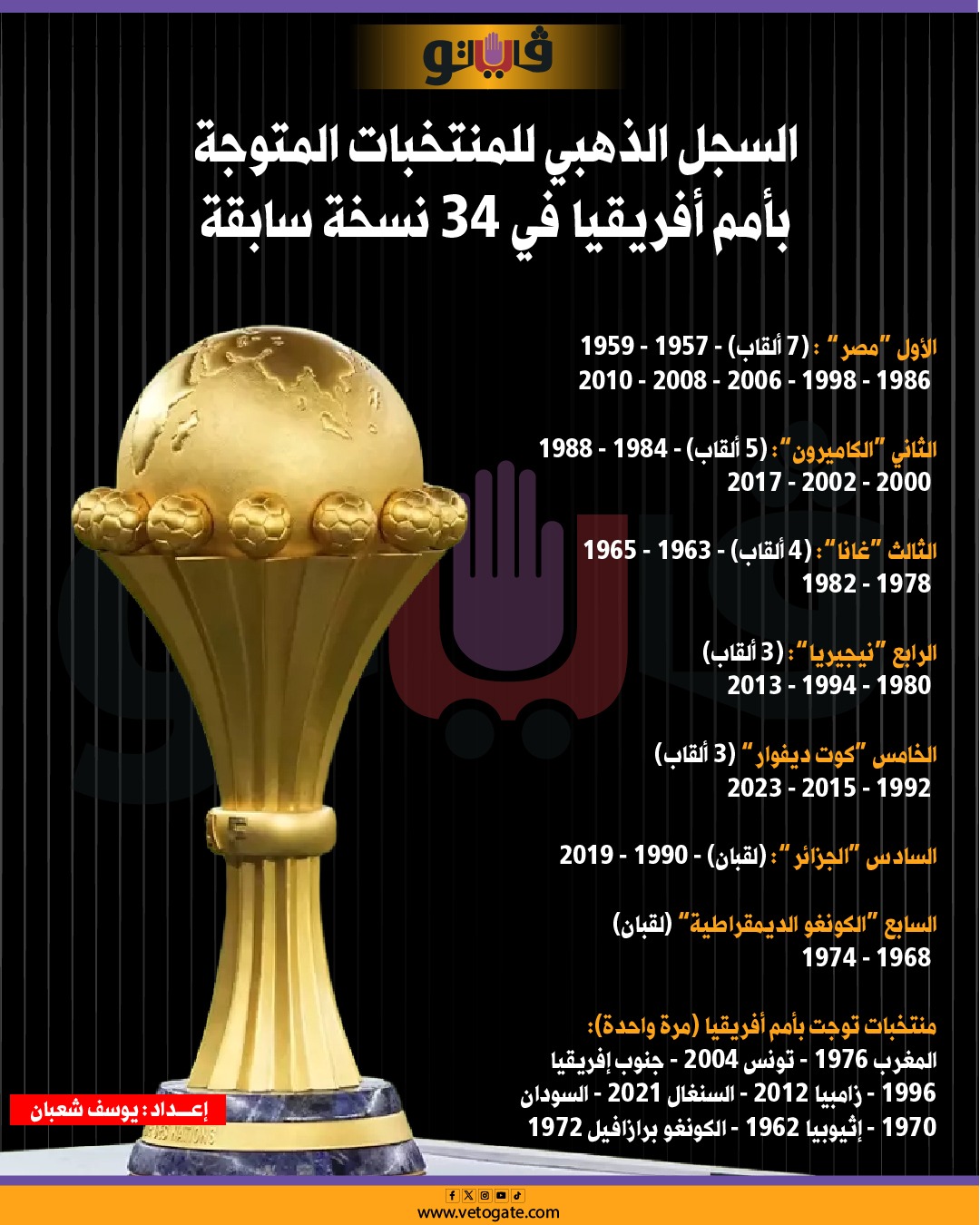 السجل الذهبي للمنتخبات المتوجة بأمم أفريقيا في 34 نسخة سابقة (إنفوجراف)