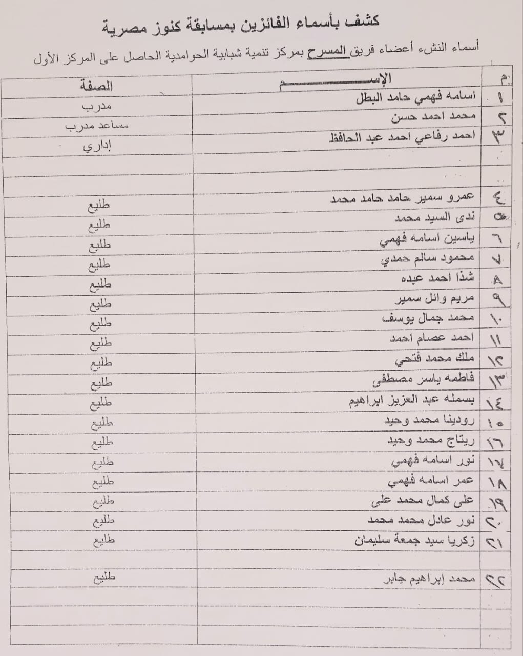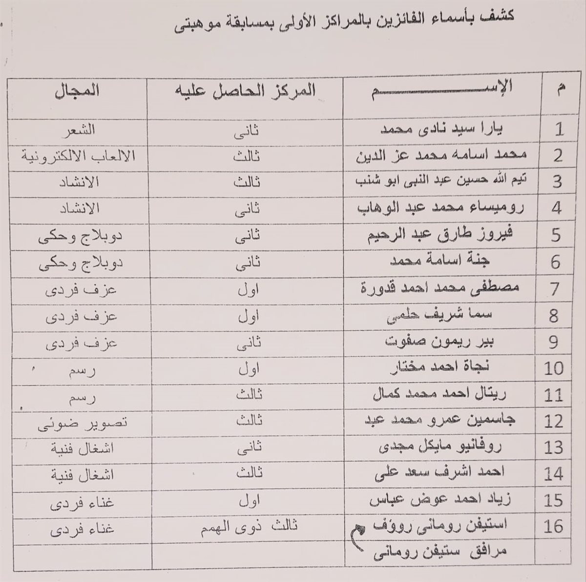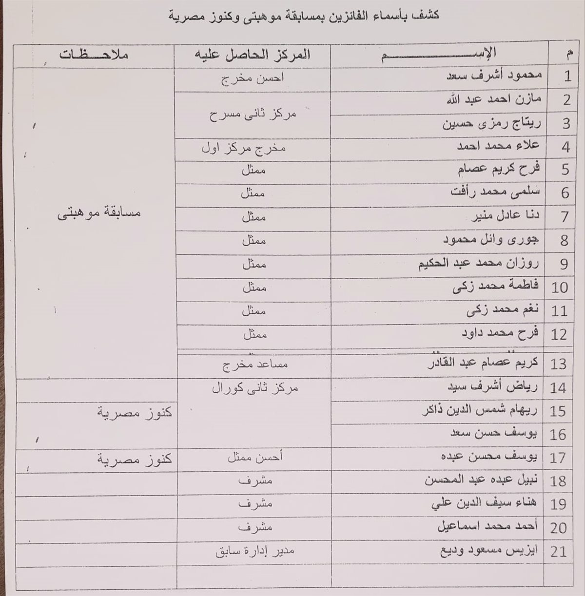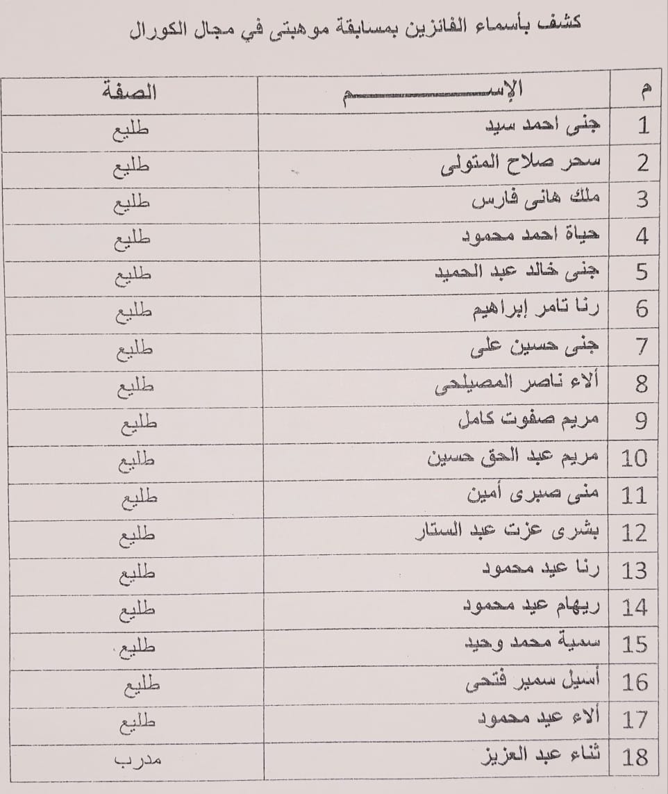 وشمل التكريم أبناء محافظة الجيزة الحاصلين على المراكز الأولى على مستوى الجمهورية في مسابقتي «موهبتي» و«كنوز مصرية» في مجالات متعددة، من بينها: الإخراج، والتمثيل، والكورال، والشعر، والألعاب الإلكترونية، والإنشاد، والدوبلاج، والحكي، والعزف الفردي، والرسم، والتصوير الضوئي، والأشغال الفنية، والغناء الفردي.