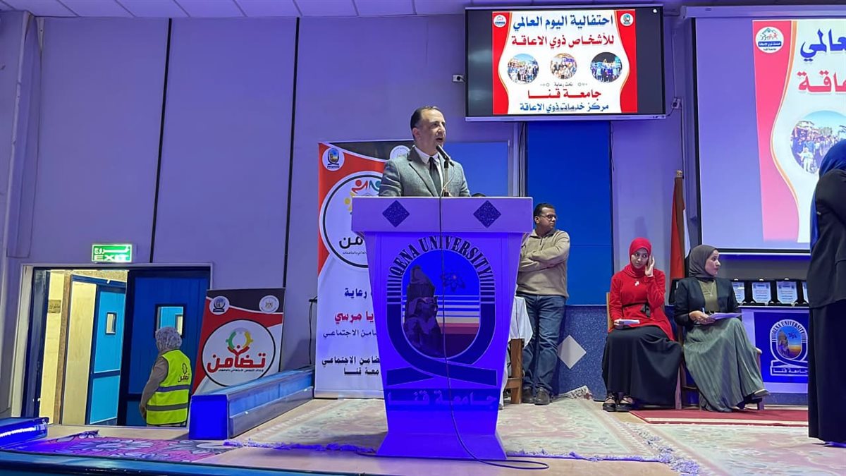 شارك الدكتور محمد العقبي مساعد وزيرة التضامن الاجتماعي للاتصال الاستراتيجي والمشرف العام على مشروع وحدات التضامن الاجتماعي في احتفالية جامعة قنا باليوم العالمي للأشخاص ذوي الإعاقة.