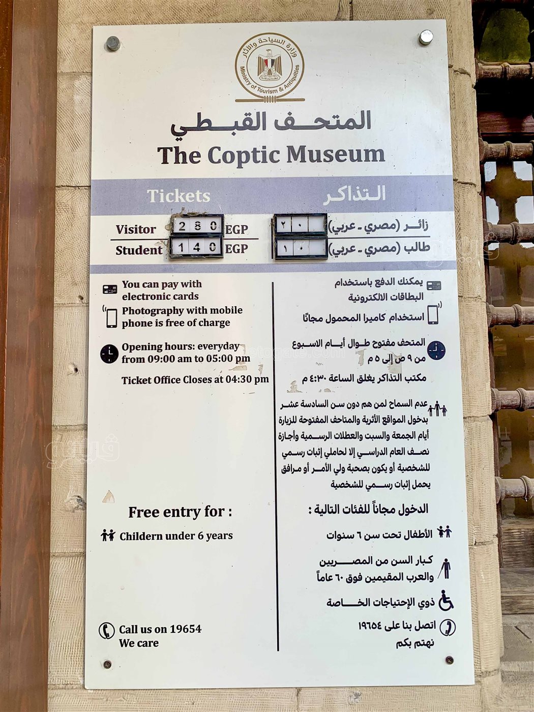 يقع المتحف القبطي في قلب مجمع الأديان بمصر القديمة، بجوار الكنيسة المعلقة وحصن بابليون. يفتح أبوابه يوميًا عادةً من التاسعة صباحًا حتى الخامسة مساءً، مع اختلافات محتملة في بعض المواسم.