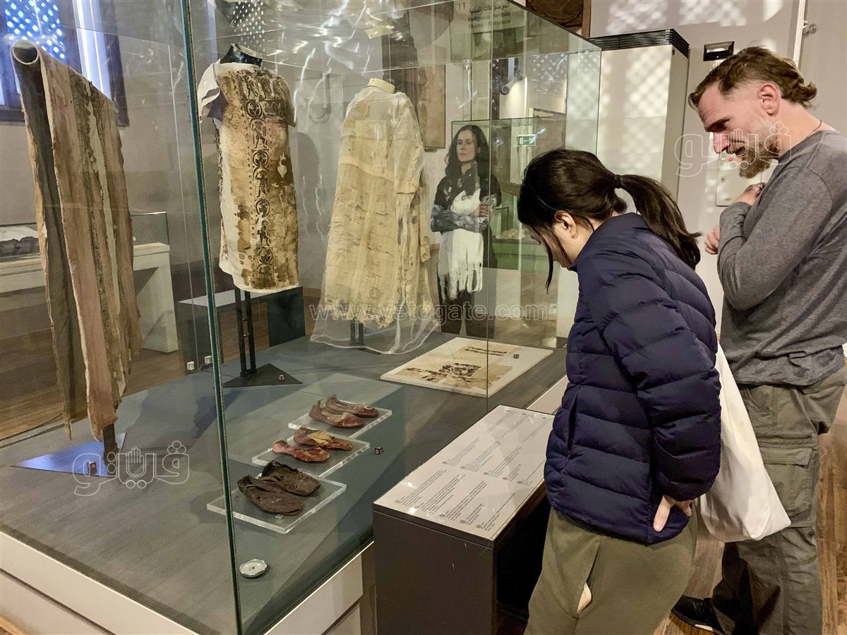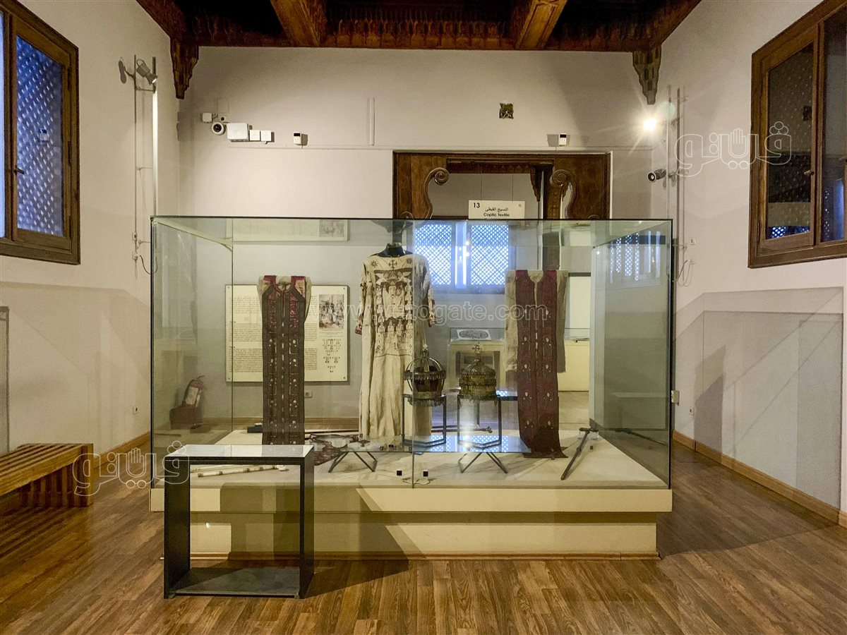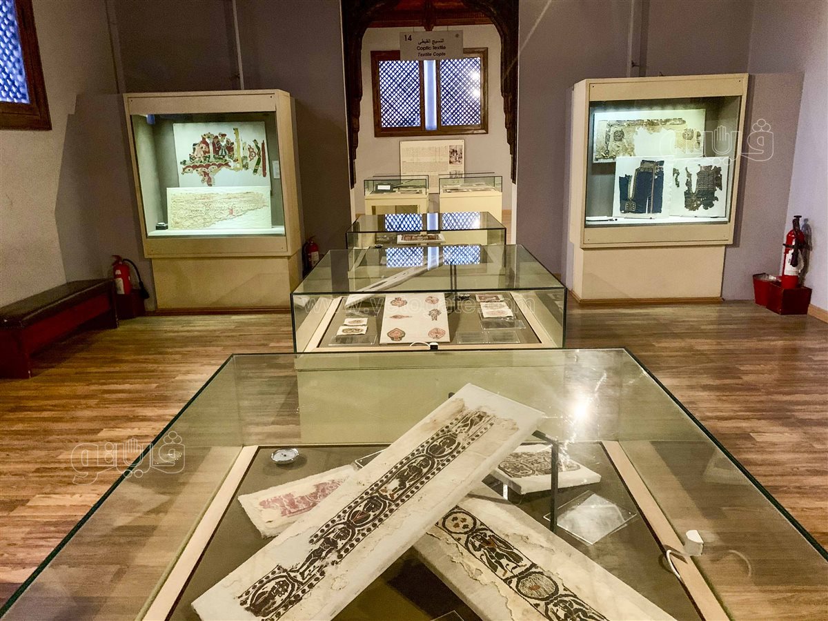 قاعة النسيج: تشمل قطعًا من الأقمشة والملابس والأكفان المطرّزة، التي كانت تعكس الحياة اليومية للفئات المختلفة، مع زخارف نباتية وحيوانية تعبّر عن ثقافة الشعب القبطي.