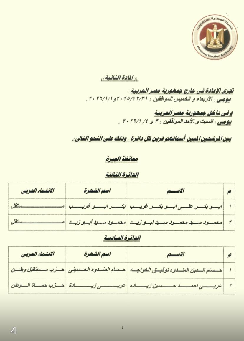 وتُجرى جولة الإعادة خارج جمهورية مصر العربية يومي الأربعاء والخميس الموافقين 31 ديسمبر 2025 و1 يناير 2026.