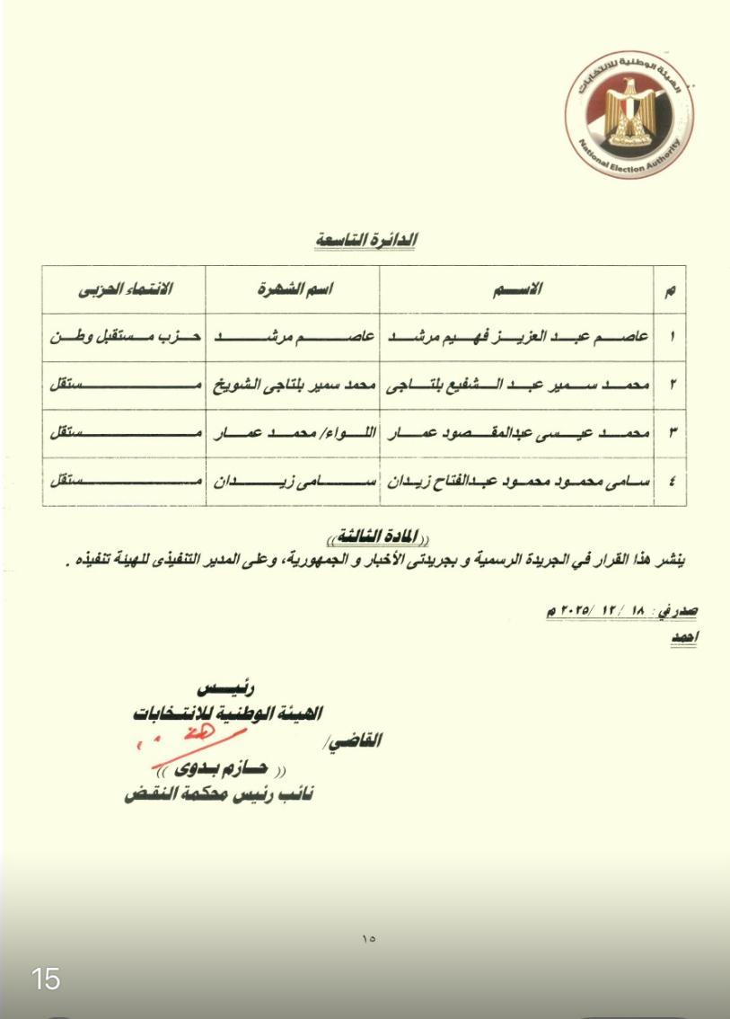 انتخابات مجلس النواب 2025، أعلنت الهيئة الوطنية للانتخابات برئاسة المستشار حازم بدوي مواعيد إجراء جولة الإعادة للمرحلة الأولى لـ 30 دائرة انتخابية الملغاة بحكم قضائي، عن المقاعد المخصصة لنظام الفردي، والتي أُجريت يومي الإثنين والثلاثاء 8 و9 ديسمبر 2025 للمصريين بالخارج.