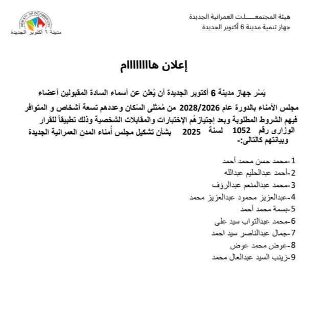 في خطوة تعكس ثقة المجتمع المحلي في الكفاءات الصحفية والوطنية، فاز الكاتب الصحفي جمال عبدالناصر بعضوية مجلس أمناء مدينة 6 أكتوبر الجديدة، وذلك بعد إعلان جهاز المدينة عن التشكيل الجديد للمجلس للدورة 2026 – 2028، تنفيذًا لقرار وزارة الإسكان بشأن تشكيل مجالس أمناء المدن العمرانية الجديدة.