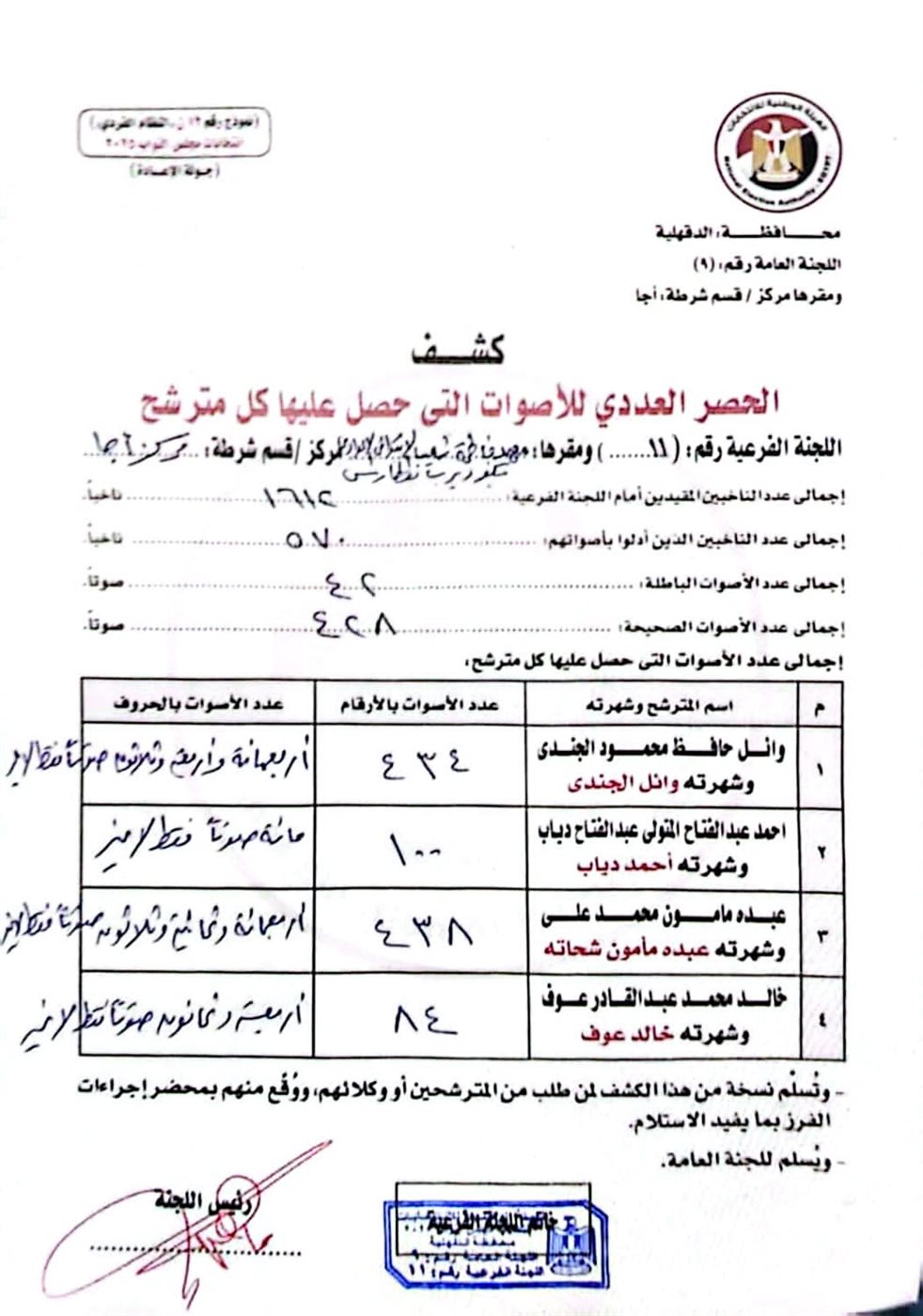 وائل حافظ محمود الجندي 434 صوتا.