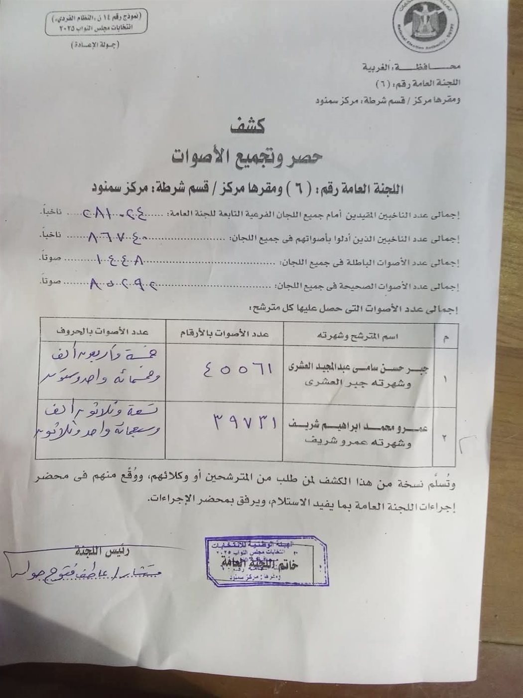 اللجنة العامة رقم 6 مركز سمنود تعلن الحصر العددي لفرز أصوات اللجان الفرعية