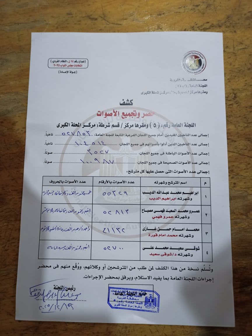 اللجنة العامة رقم 5 مركز المحلة الكبري تعلن الحصر العددي لفرز أصوات اللجان الفرعية