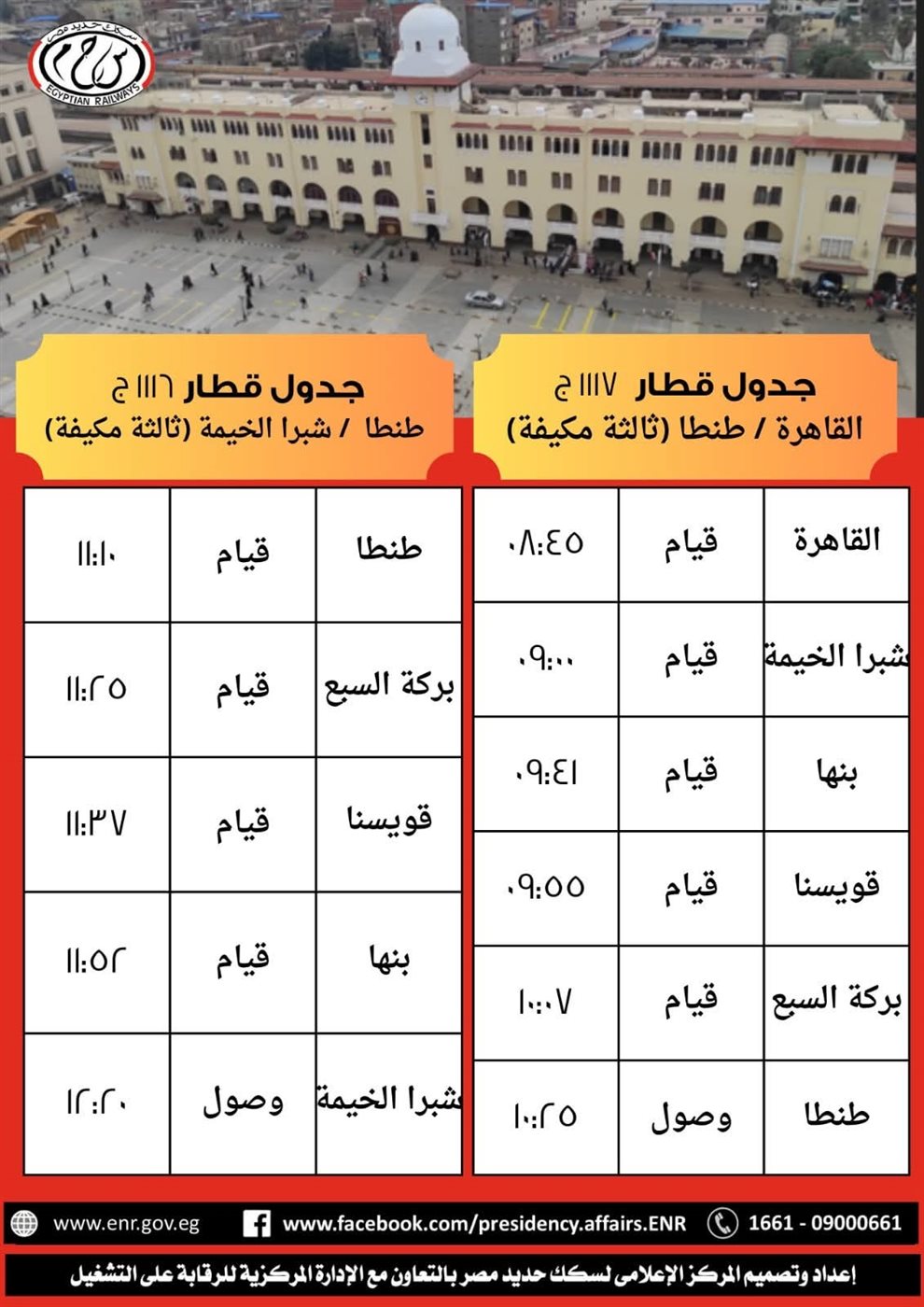 * القطار رقم (1117) بعربات درجة ثالثة مكيفة، يقوم من محطة القاهرة الساعة 8:45 صباحًا ويصل إلى محطة طنطا الساعة 10:25 صباحًا طبقًا للجدول المرفق ولا يعمل أيام الجمع والعطلات.