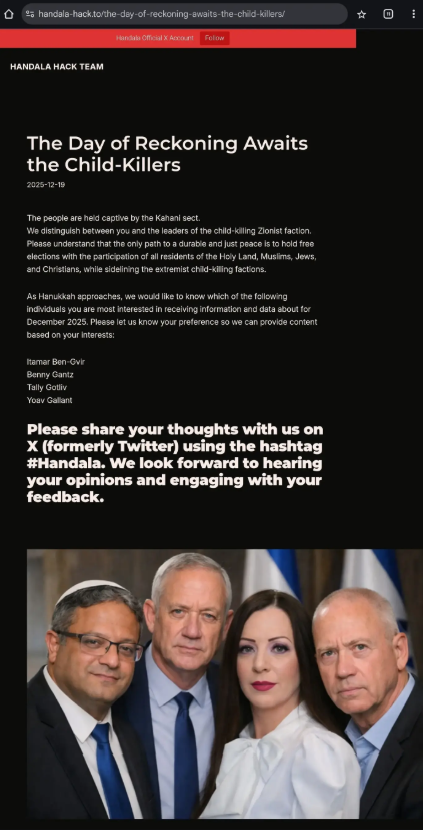 وأضافت المجموعة: "المسار الوحيد لسلام دائم وعادل هو إجراء انتخابات حرة بمشاركة جميع سكان الأرض المقدسة، من مسلمين ويهود ومسيحيين، مع تهميش الفصائل المتطرفة القاتلة للأطفال". وأشارت إلى قرب عيد الحانوكا، مطالبة بمعرفة الأفراد الذين يهتم الجمهور الإسرائيلي بمتابعتهم خلال شهر ديسمبر 2025، لتقديم المحتوى المناسب لهم، مستهدفة وزير الأمن القومي إيتمار بن غفير، والوزير السابق بيني جانتس، وعضو الكنيست تالي جوتليب، ووزير الدفاع الأسبق يوآف جالانت، مع نشر صورة لهم.