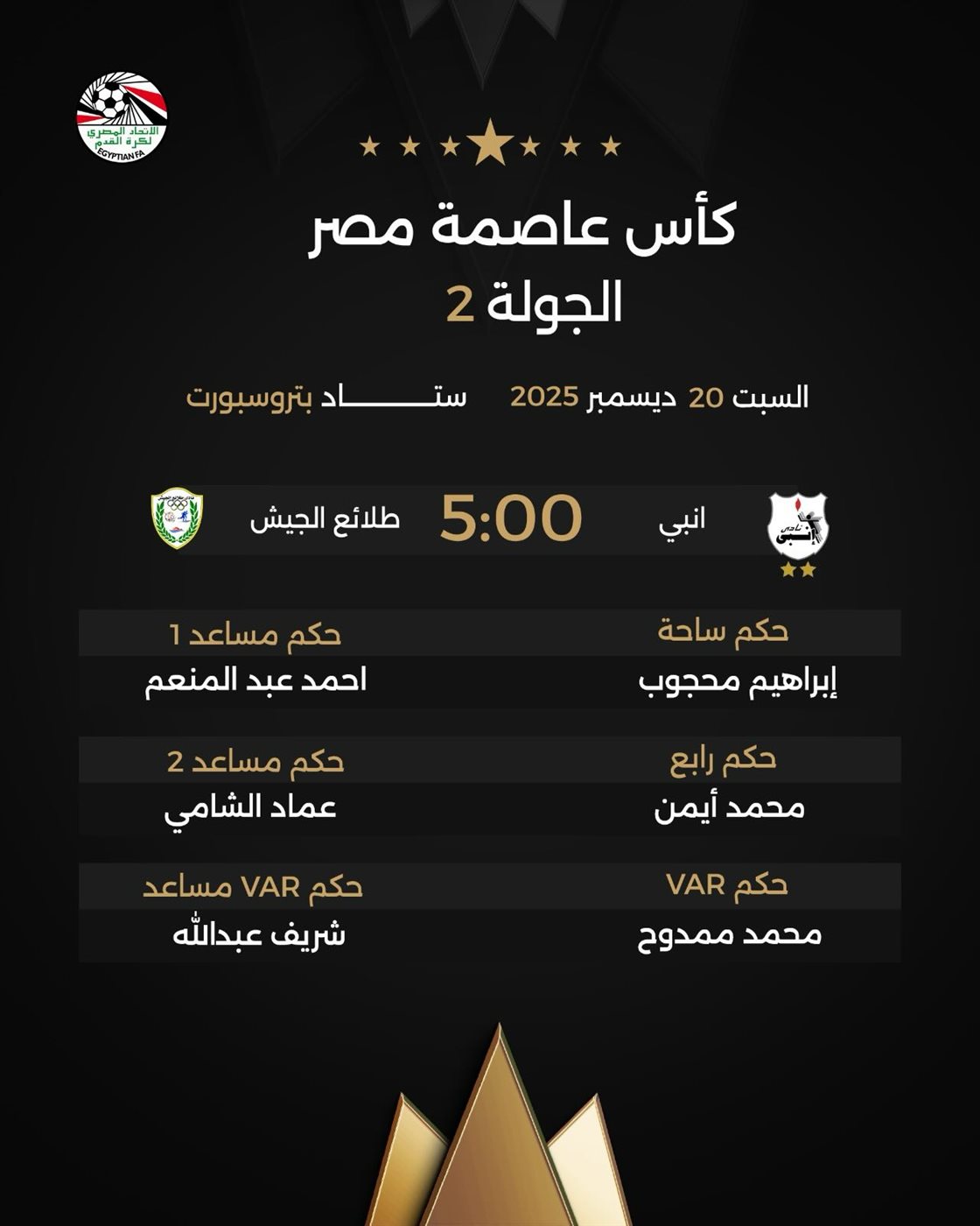 كأس عاصمة مصر، يلتقي فريقا إنبي وطلائع الجيش في الخامسة مساء اليوم السبت على ستاد بتروسبورت، ضمن لقاءات الجولة الثانية ببطولة كأس عاصمة مصر.