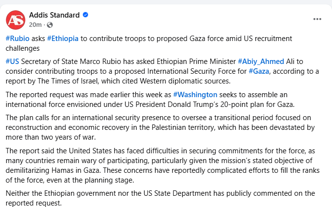 مشاركة قوات إثيوبية في غزة، ذكرت صحيفة "أديس ستاندرد" الإثيوبية أن وزير الخارجية الأمريكي ماكو روبيو طلب من إثيوبيا المساهمة بقوات في القوة المقترحة لغزة، وسط ما وصفته بـ "تحديات التجنيد الأمريكية"، الأمر الذي وصفه بعض المراقبون بالغريب.