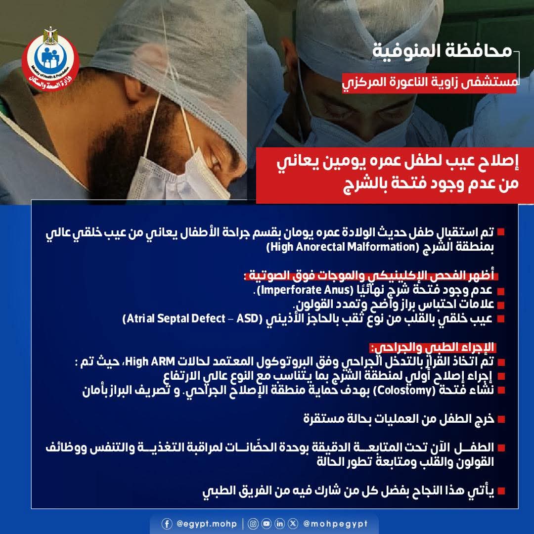 أعلنت وزارة الصحة عن نجاح فريق طبي بمستشفى زاوية الناعورة المركزي بمحافظة المنوفية في إجراء تدخل جراحي دقيق لإصلاح عيب خلقي نادر لطفل حديث الولادة يبلغ من العمر يومين، كان يعاني من عدم وجود فتحة الشرج، ضمن حالات العيوب الخلقية عالية الارتفاع.