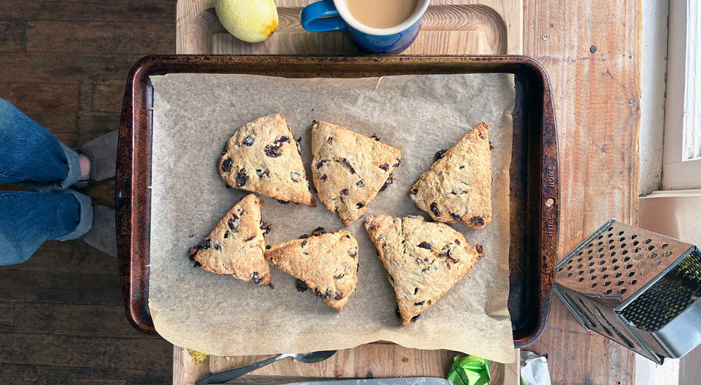 تخلط المكونات الجافة أولا، ثم تضاف الزبدة الباردة وتفرك حتى تصبح كالمزيج الرملي، ويضاف التوت وبشر الليمون ثم اللبن تدريجيا حتى تتشكل عجينة متماسكة، وتفرد العجينة وتقطع إلى مثلثات، ثم تخبز في فرن ساخن حتى تكتسب لون ذهبي.