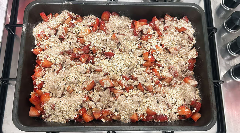 توضع الفراولة الممزوجة بالزنجبيل في قاعدة طبق الفرن. في وعاء منفصل، يخلط الشوفان والجوز مع السكر والزيت والذبدة، ثم يوزع الخليط فوق الفراولة، يخبز الطبق حتى تخرج الفراولة عصارتها وتصبح الطبقة العلوية مقرمشة.