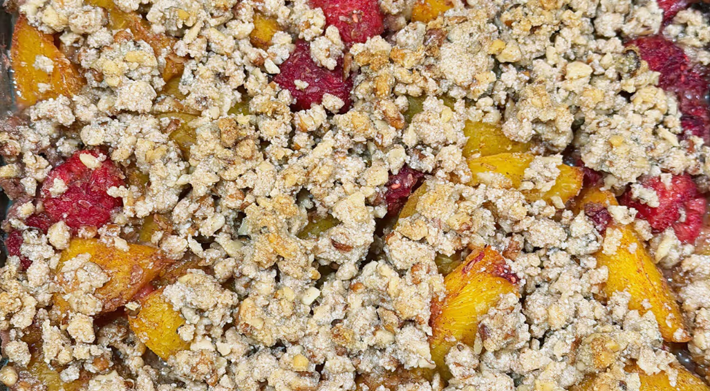 توضع طبقة الخوخ والتوت في القالب، يجهز "الكرامبل" بخلط الدقيق والجوز والقرفة مع قليل من الزبدة أو الزيت، وينصح بمضاعفة كمية الكرامبل لتغطية الفاكهة بالكامل، ثم يخبز في الفرن،و يمكن تقديمه مع الزبادي اليوناني لإضافة نكهة غنية.