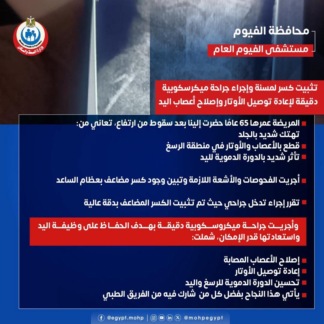 أعلنت وزارة الصحة والسكان عن نجاح فريق طبي بمستشفى الفيوم العام في إجراء تدخل جراحي دقيق لسيدة تبلغ من العمر 65 عامًا، بعد تعرضها لسقوط من ارتفاع أسفر عن إصابات بالغة في اليد.