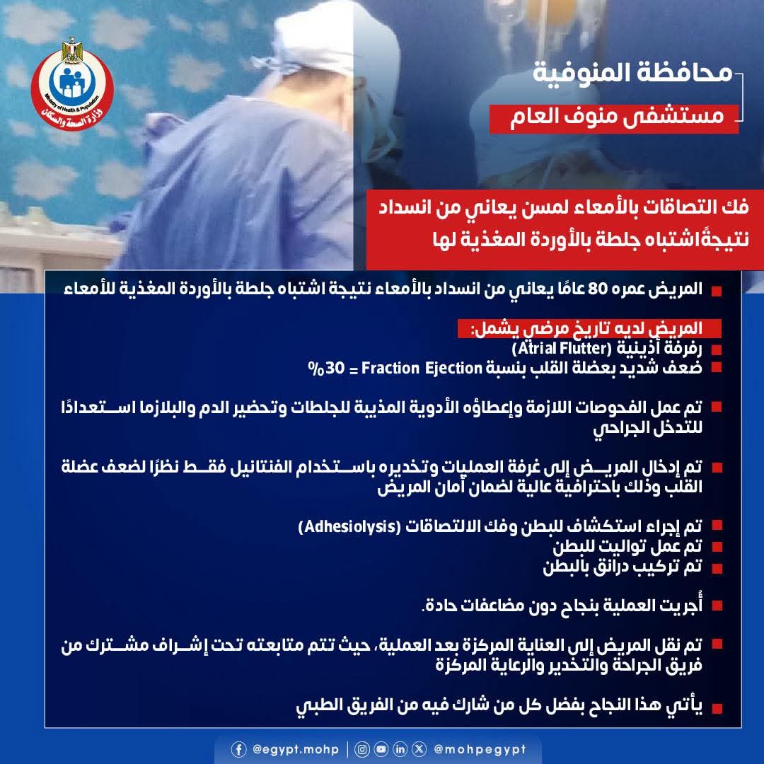 فيما أعلن فريق طبي بمستشفى منوف العام بمحافظة المنوفية عن نجاح تدخل جراحي دقيق لمريض مسن يبلغ من العمر 80 عامًا، كان يعاني من انسداد معوي نتيجة اشتباه جلطة بالأوردة المغذية للأمعاء.