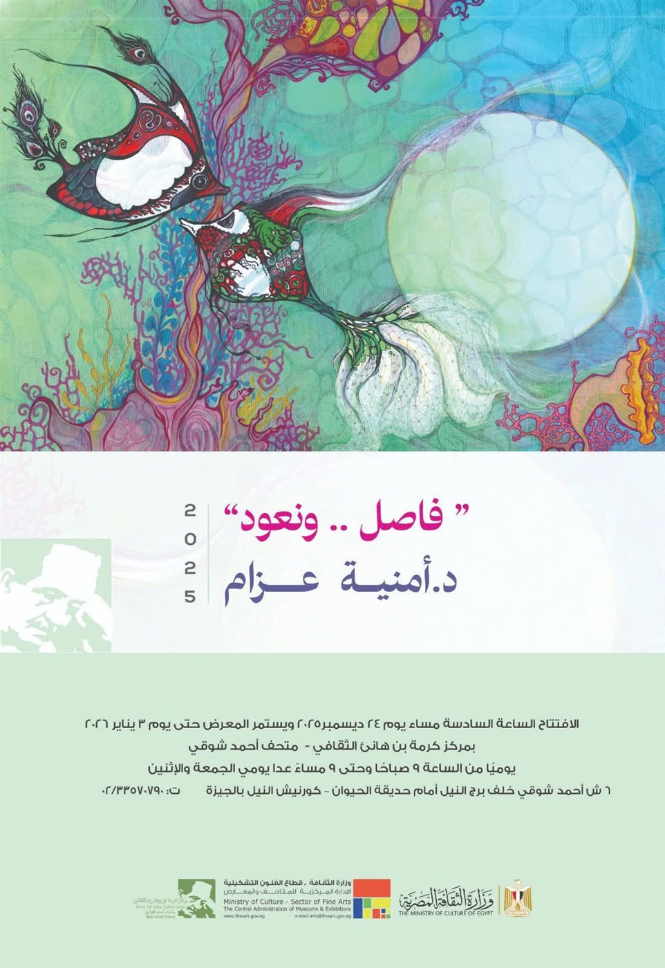 أعلن قطاع الفنون التشكيلية برئاسة الدكتور وليد قانوش عن افتتاح معرض “فاصل ونعود” للفنانة الدكتورة أمينة عزام، في مركز كرمة ابن هانئ الثقافي بمتحف أحمد شوقي، وذلك في تمام الساعة الـ 6 مساء يوم الأربعاء الموافق 24 ديسمبر.