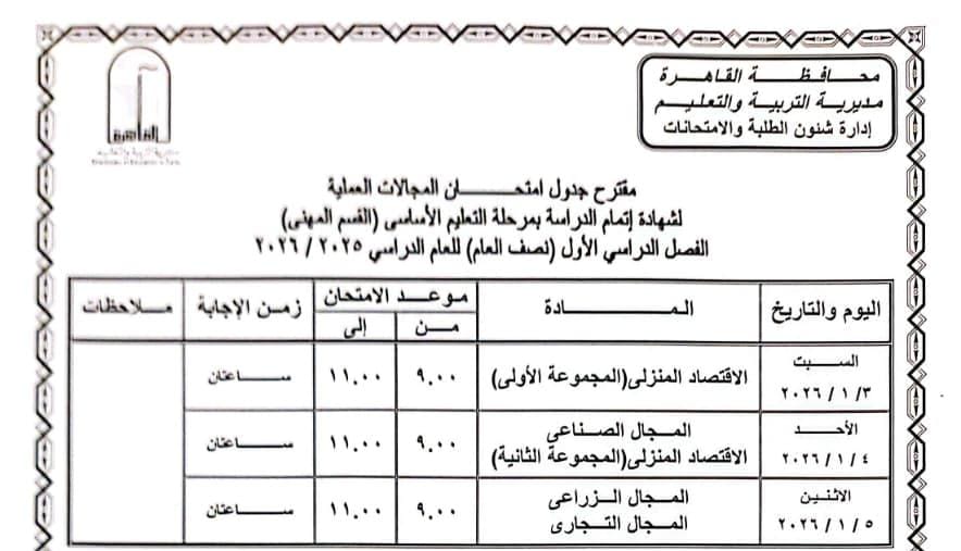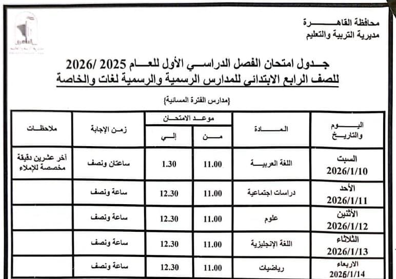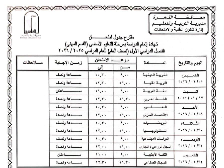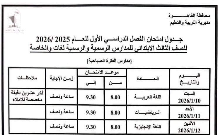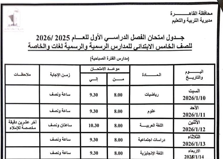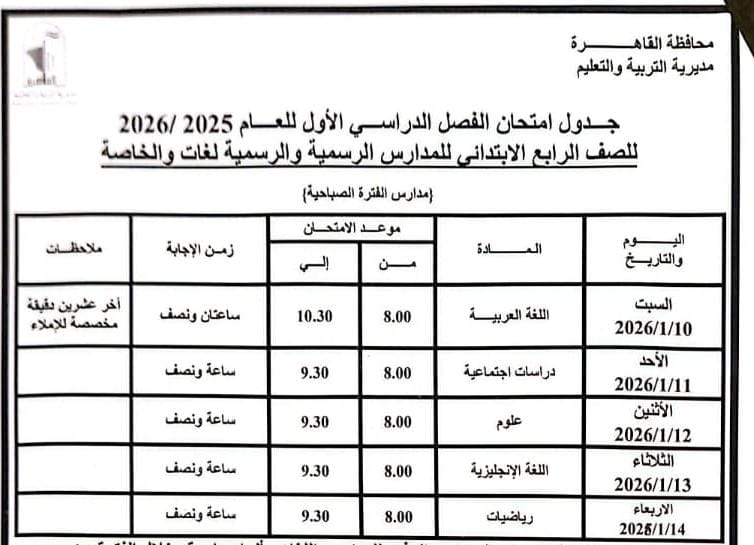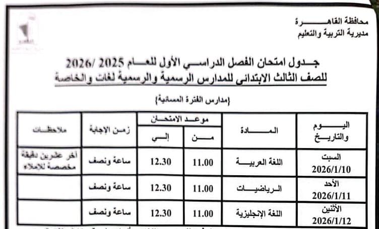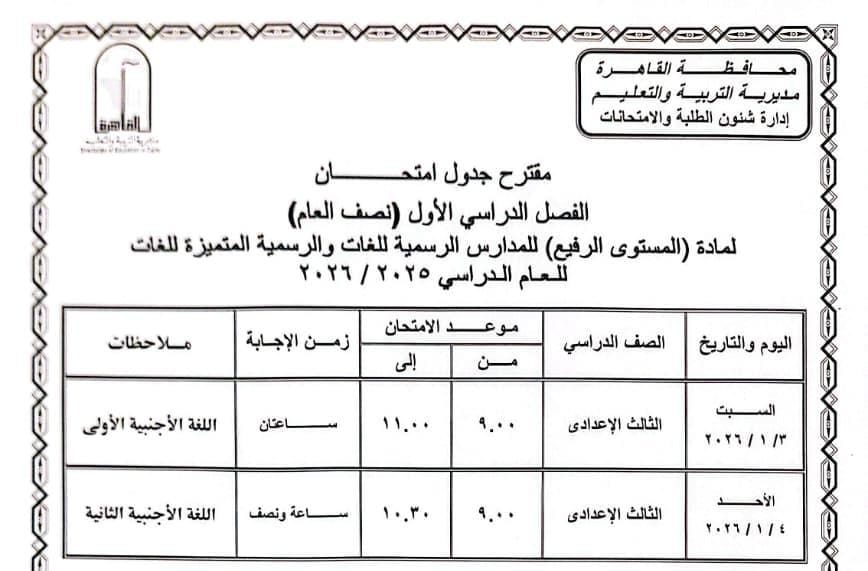 اعتمد الدكتور إبراهيم صابر محافظ القاهرة جدول امتحانات الفصل الدراسي الأول للعام الدراسى ٢٠٢٥ / ٢٠٢٦.