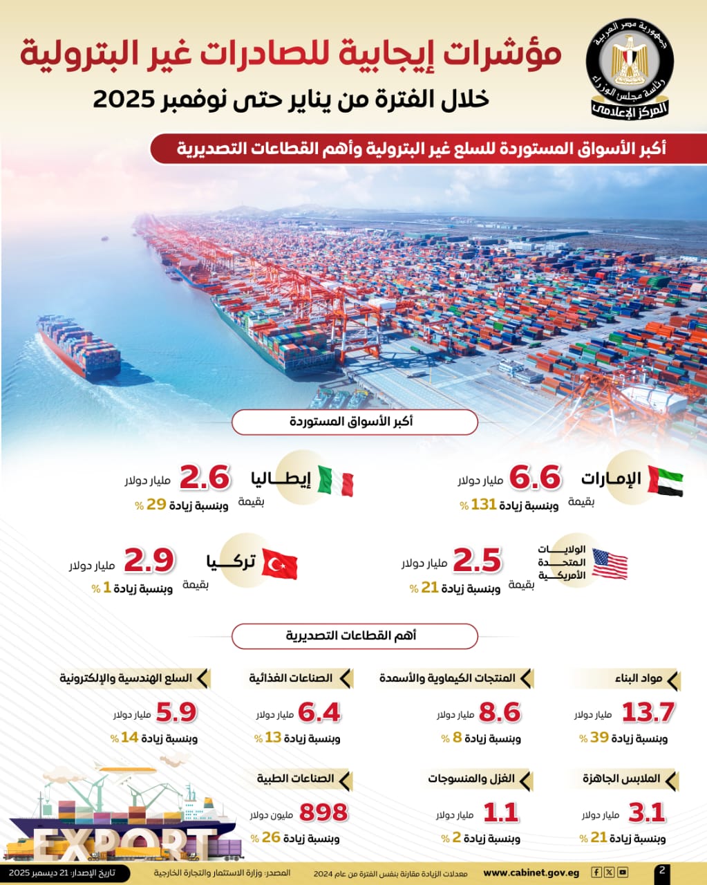 زيادة قيمة الصادرات غير البترولية بنسبة 18.4%، لتصل إلى 44.4 مليار دولار خلال الفترة من يناير حتى نوفمبر 2025