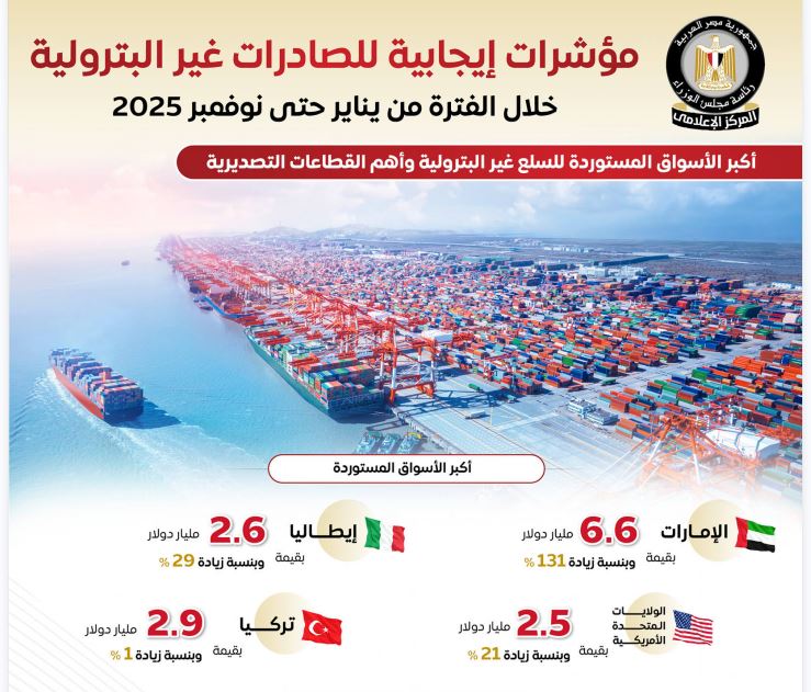 رصد المركز الإعلامي لمجلس الوزراء، المؤشرات الإيجابية لـ الصادرات غير البترولية خلال الفترة من يناير حتى نوفمبر 2025. والتى تضمنت رصد لـ أكبر الأسواق المستوردة للسلع غير البترولية المصرية.