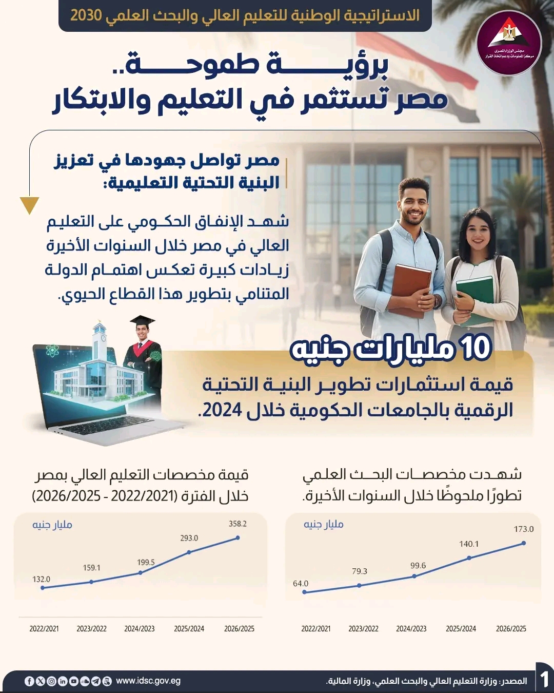 وكشفت أحدث البيانات الصادرة عن وزارة التعليم العالي والبحث العلمي ووزارة المالية، عن طفرة غير مسبوقة في حجم الإنفاق الحكومي الموجه لتطوير قطاع التعليم العالي والبحث العلمي والابتكار، وذلك تماشيًا مع "الاستراتيجية الوطنية للتعليم العالي والبحث العلمي 2030".