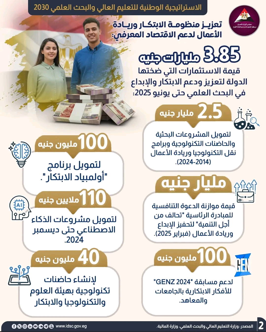 خصصت الدولة استثمارات بقيمة 3.85 مليار جنيه لتعزيز منظومة الابتكار والإبداع في البحث العلمي حتى يونيو 2025، وتوزعت هذه الاستثمارات لتشمل عدة محاور حيوية: