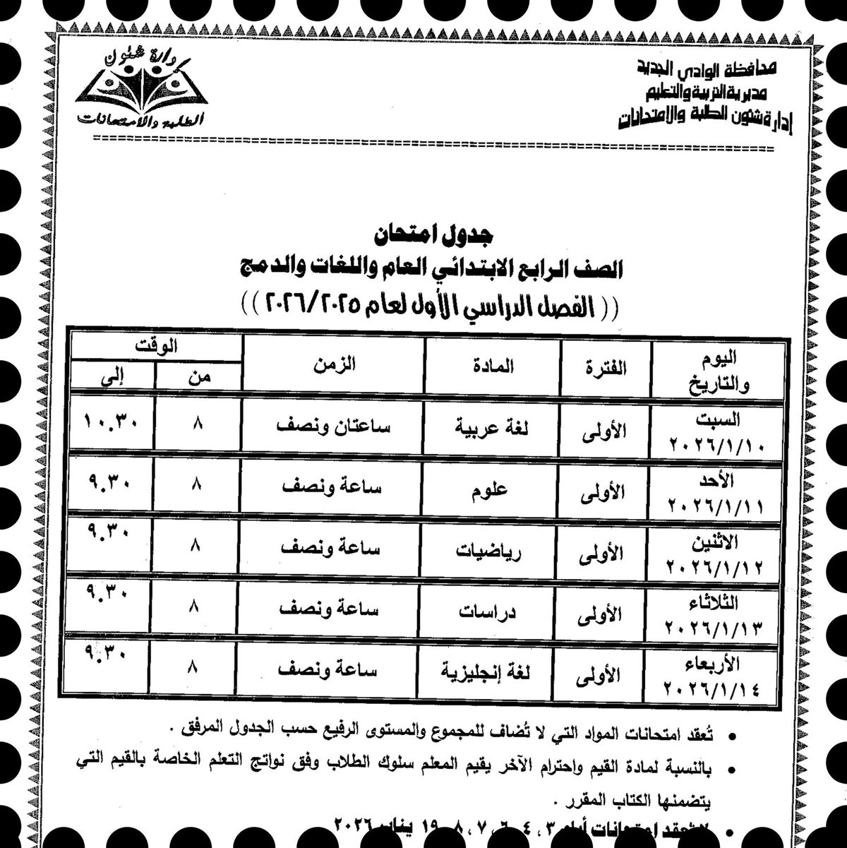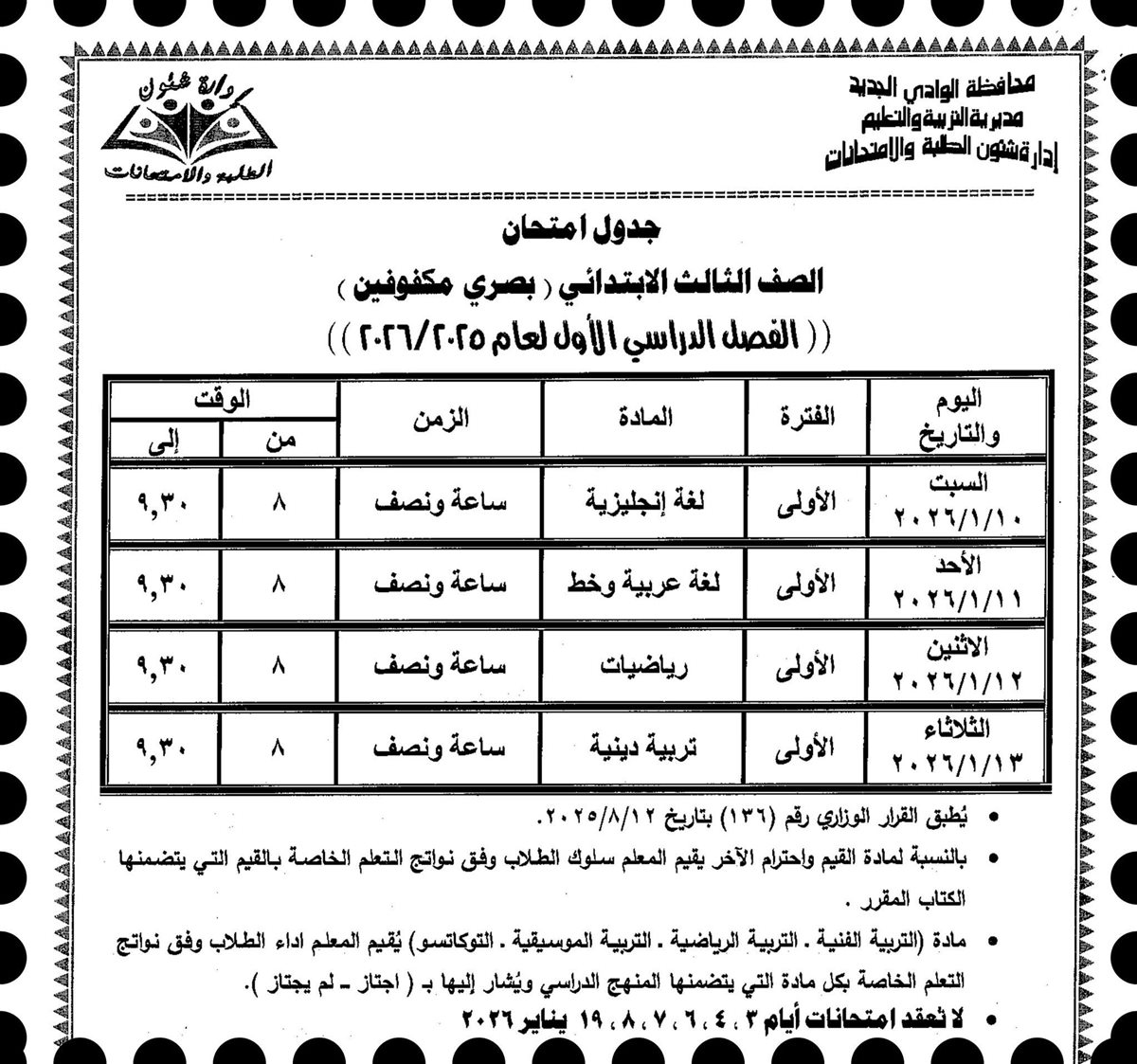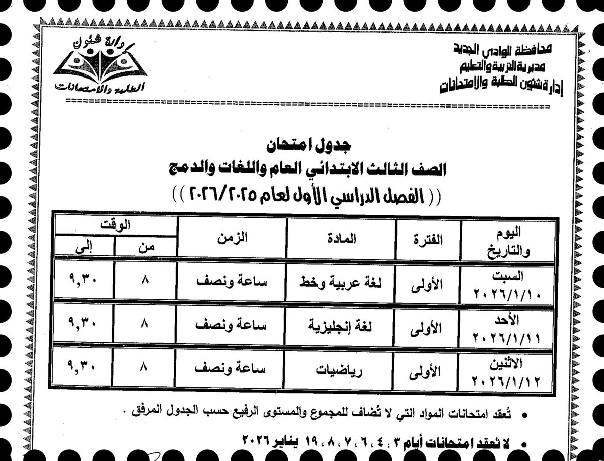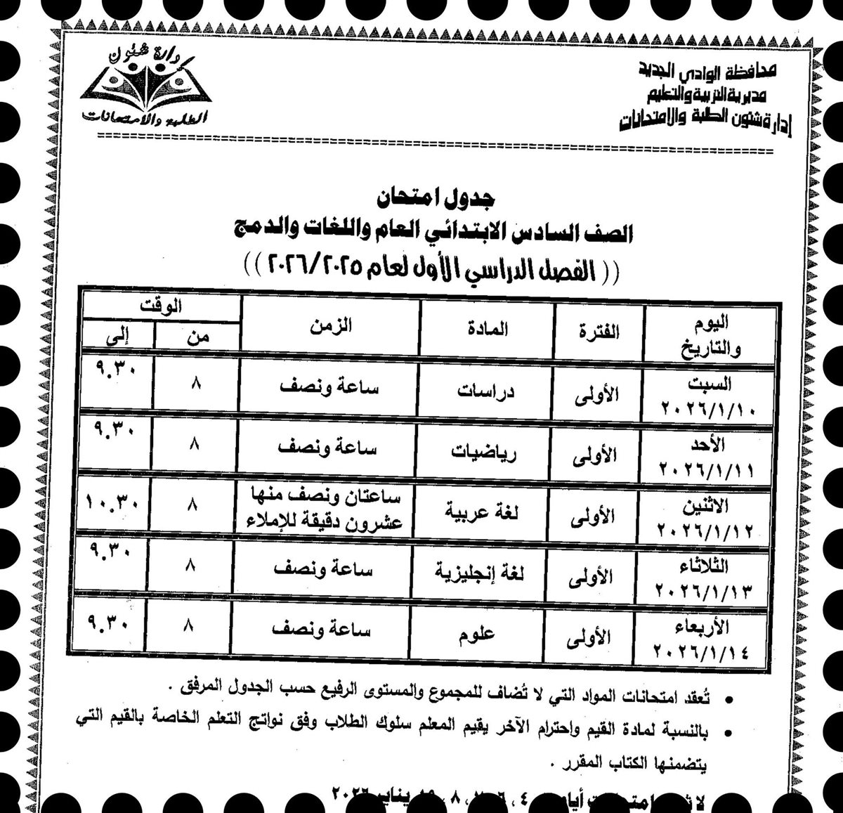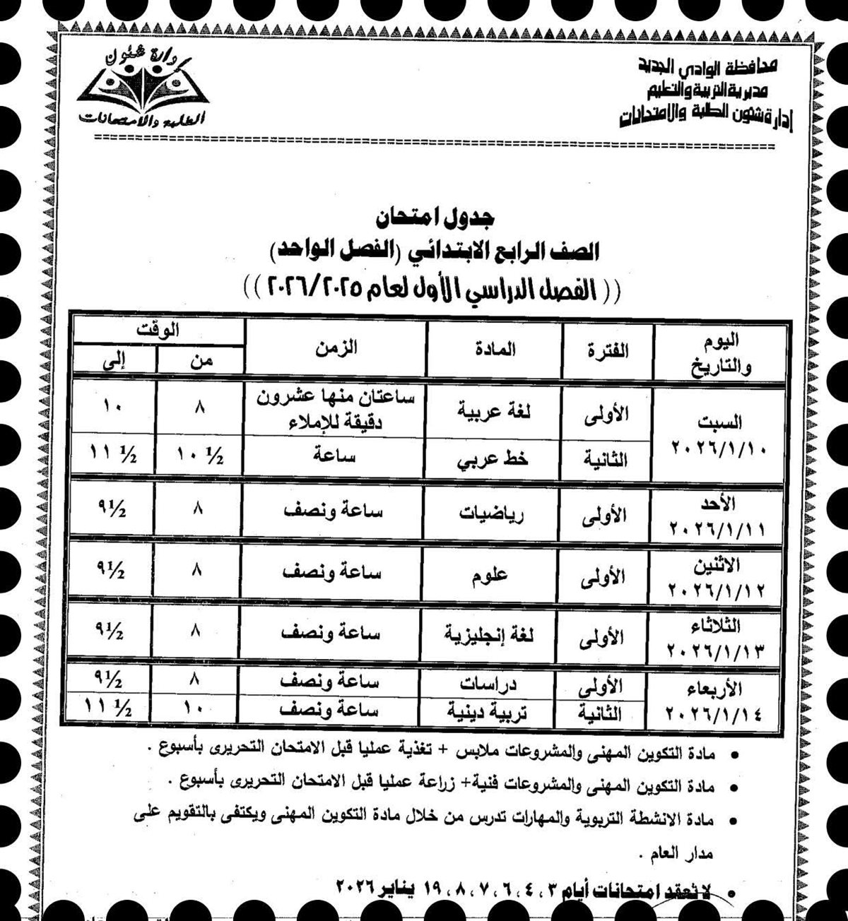 جداول امتحانات الفصل الدراسي الأول لجميع صفوف النقل في الوادي الجديد