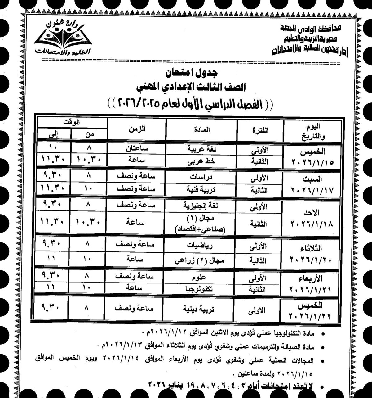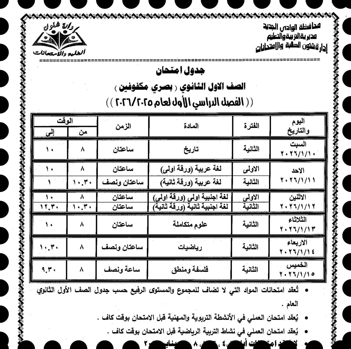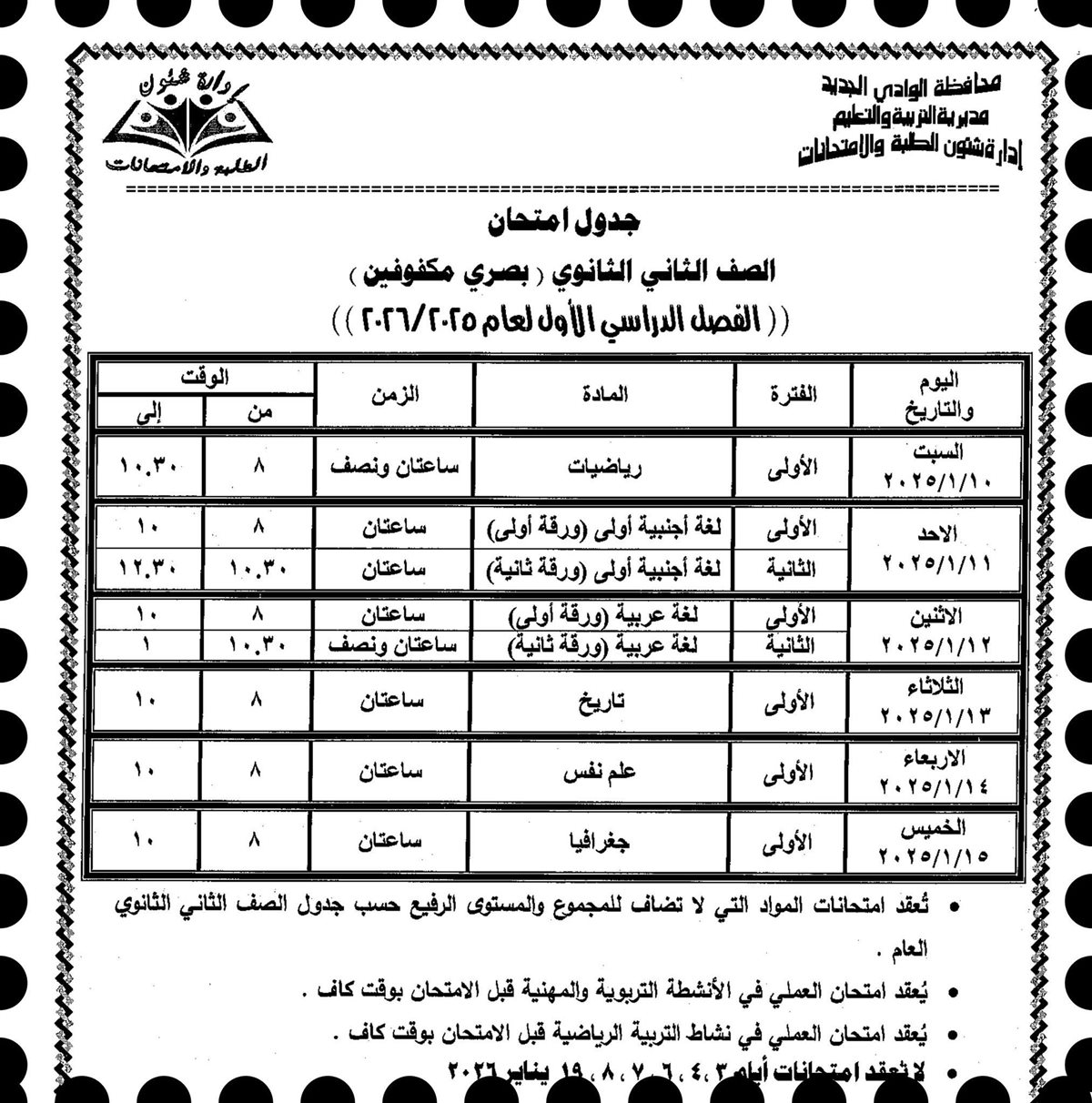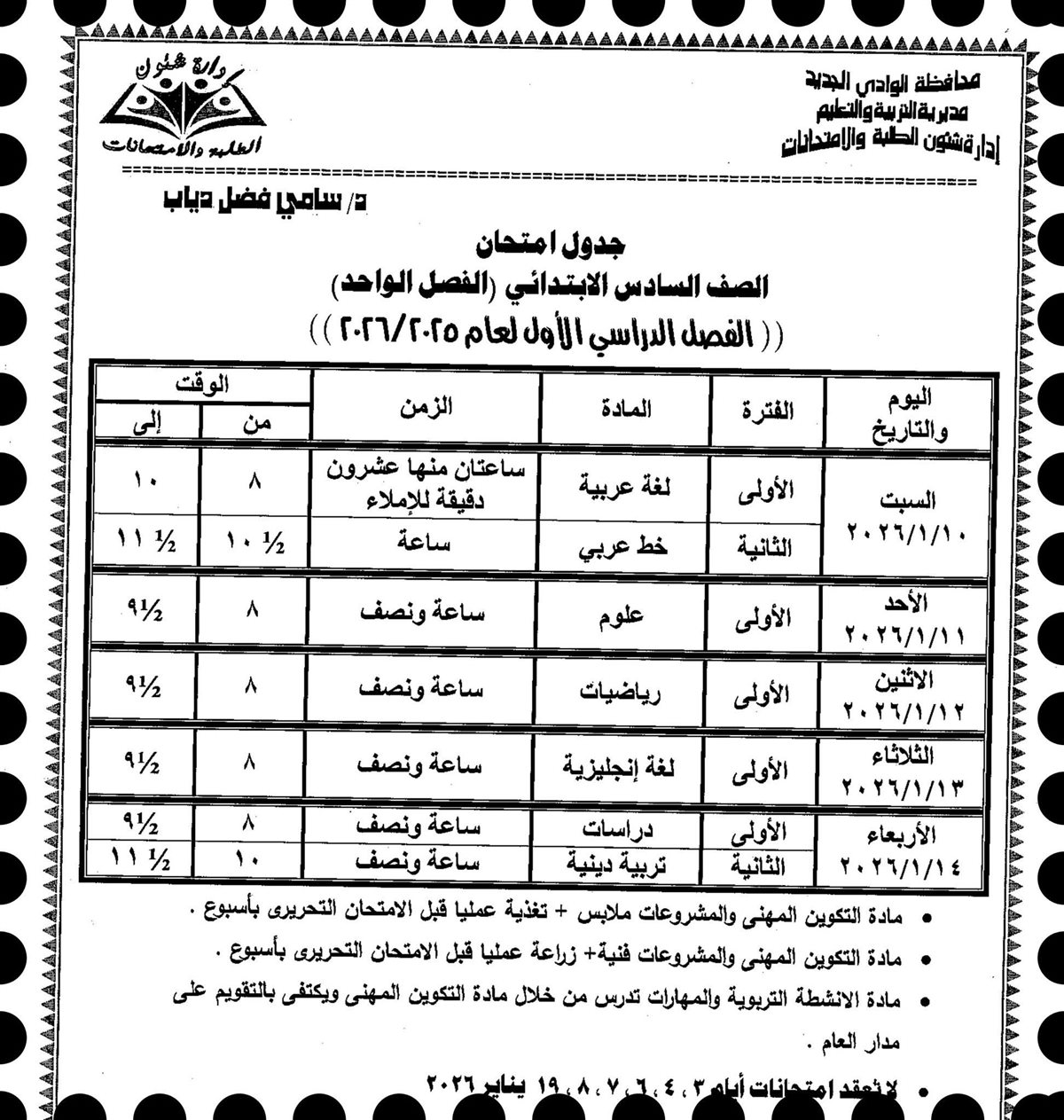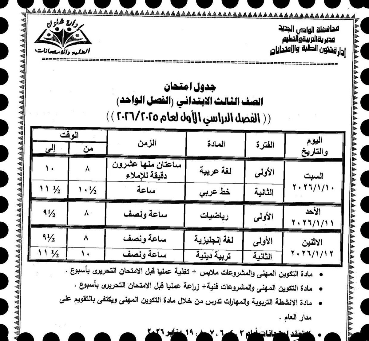 جداول امتحانات الفصل الدراسي الأول لجميع صفوف النقل في الوادي الجديد