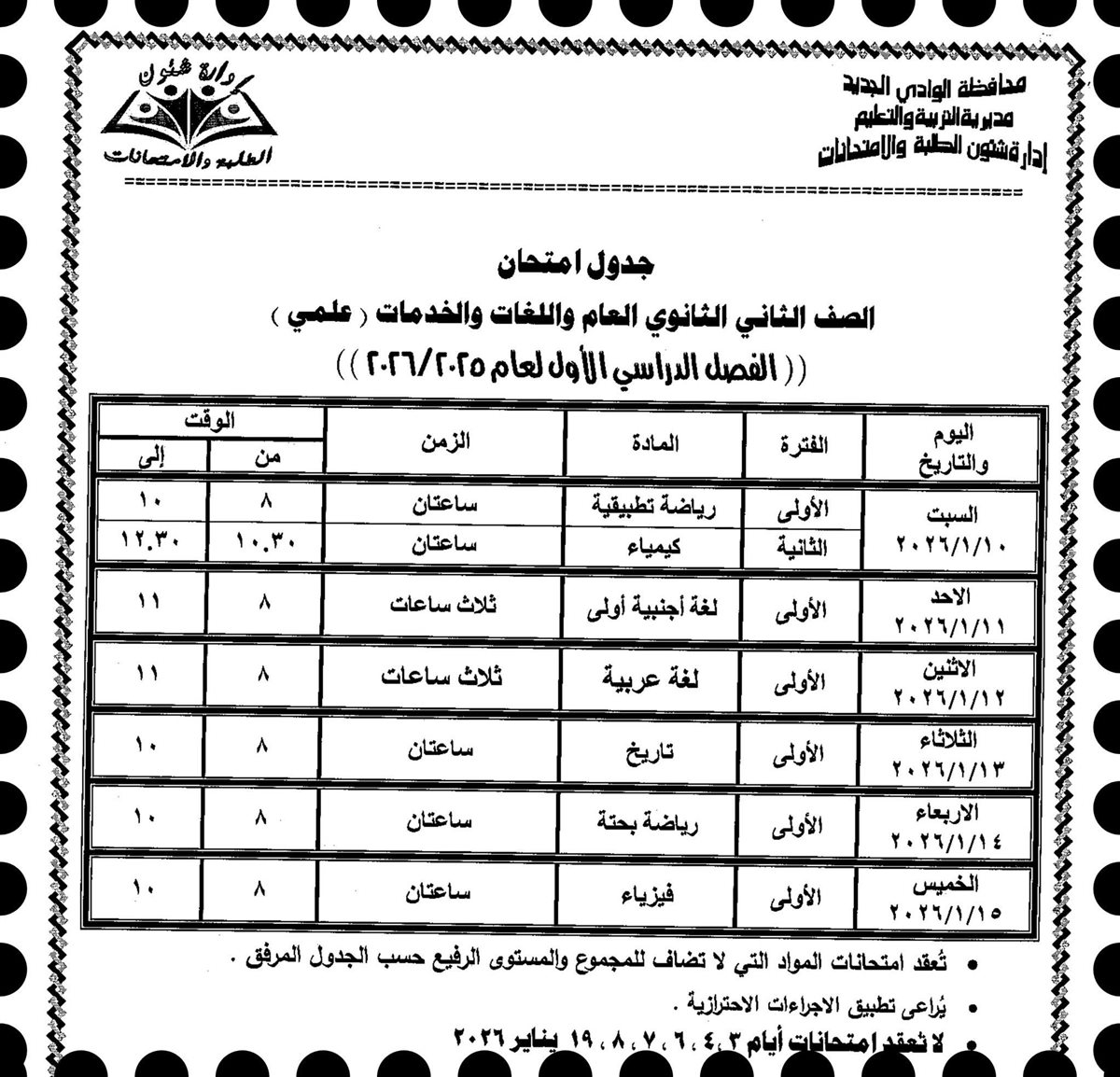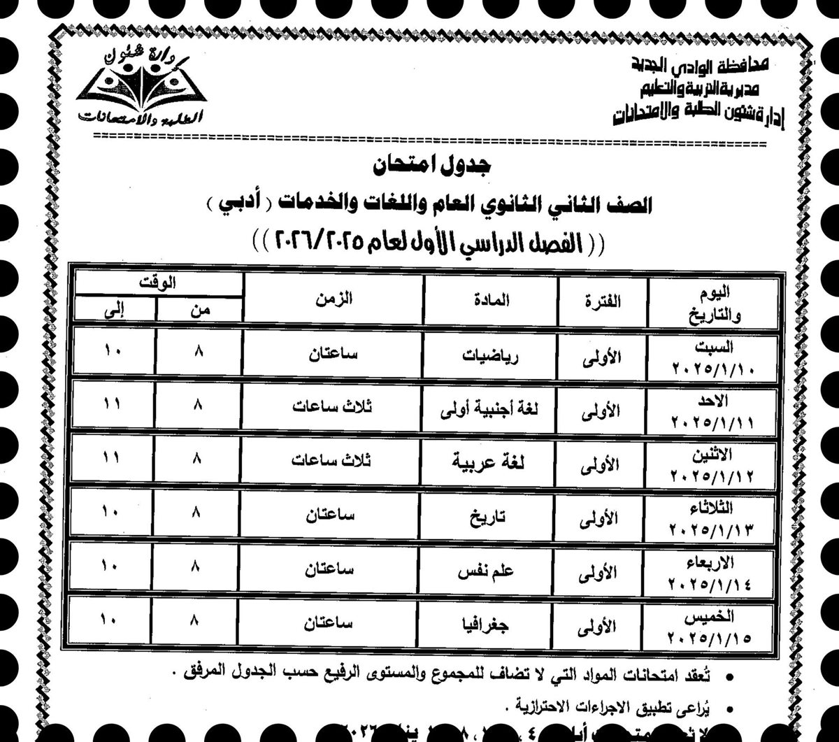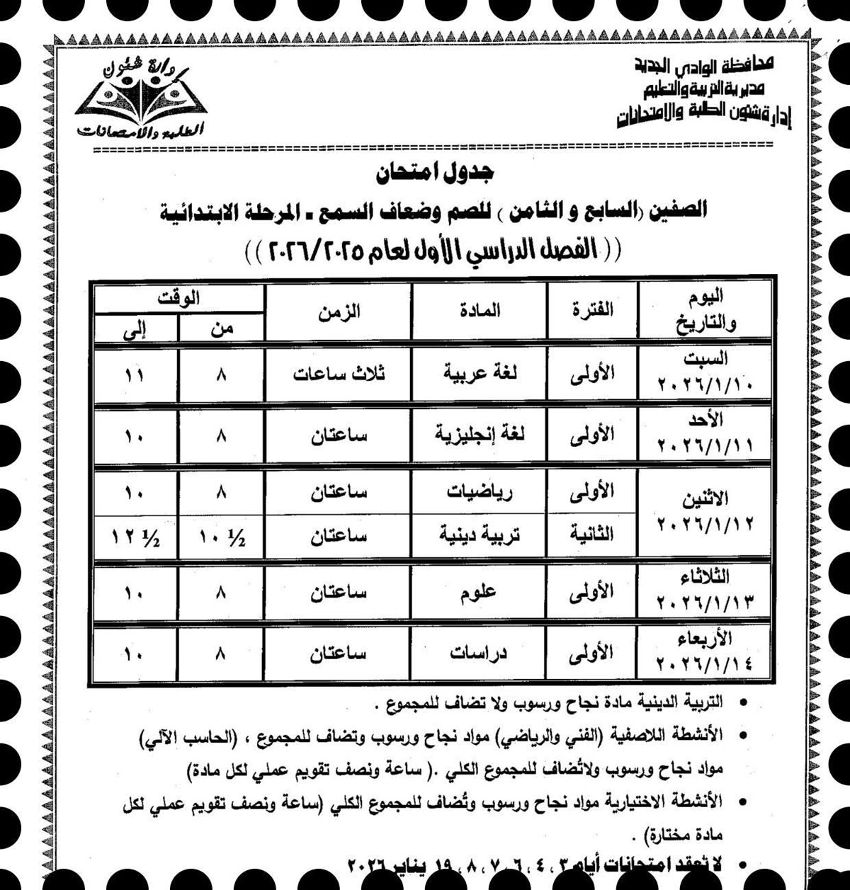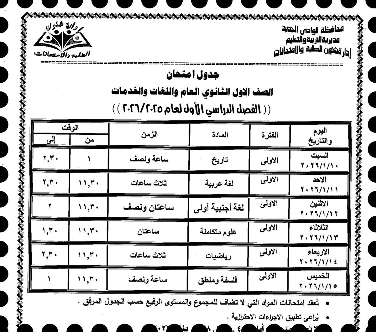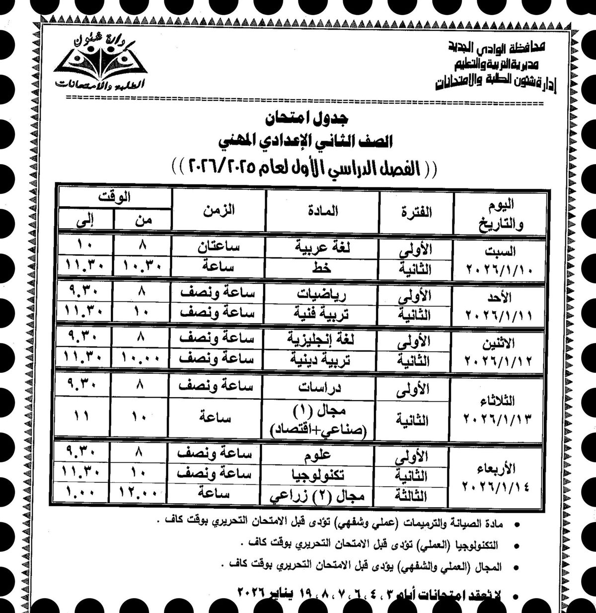 جداول امتحانات الفصل الدراسي الأول لجميع صفوف النقل في الوادي الجديد