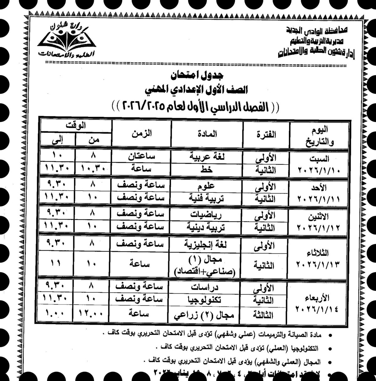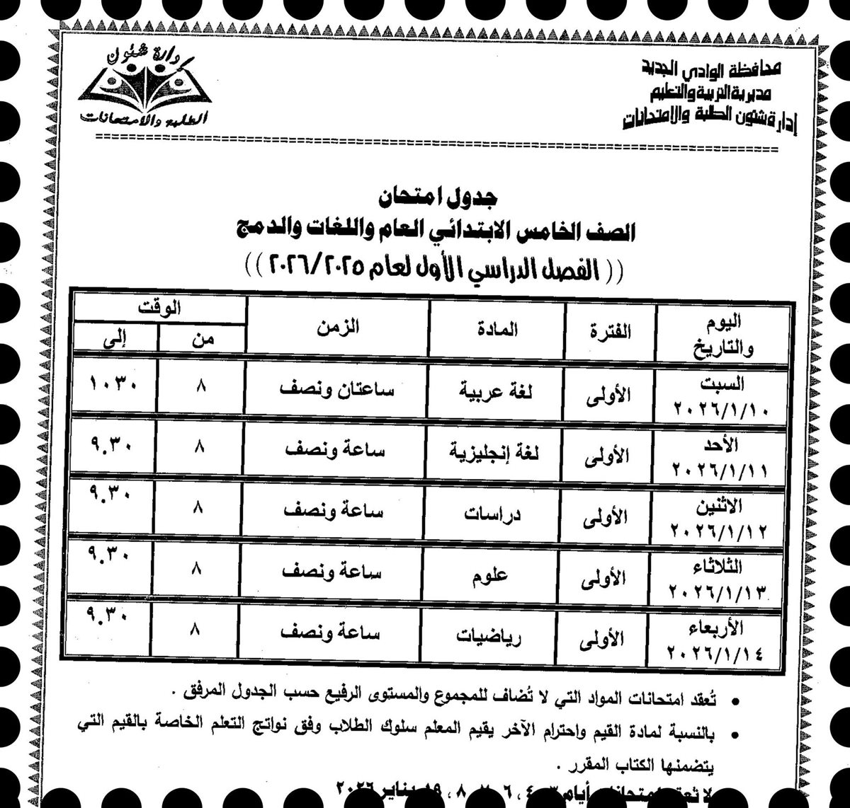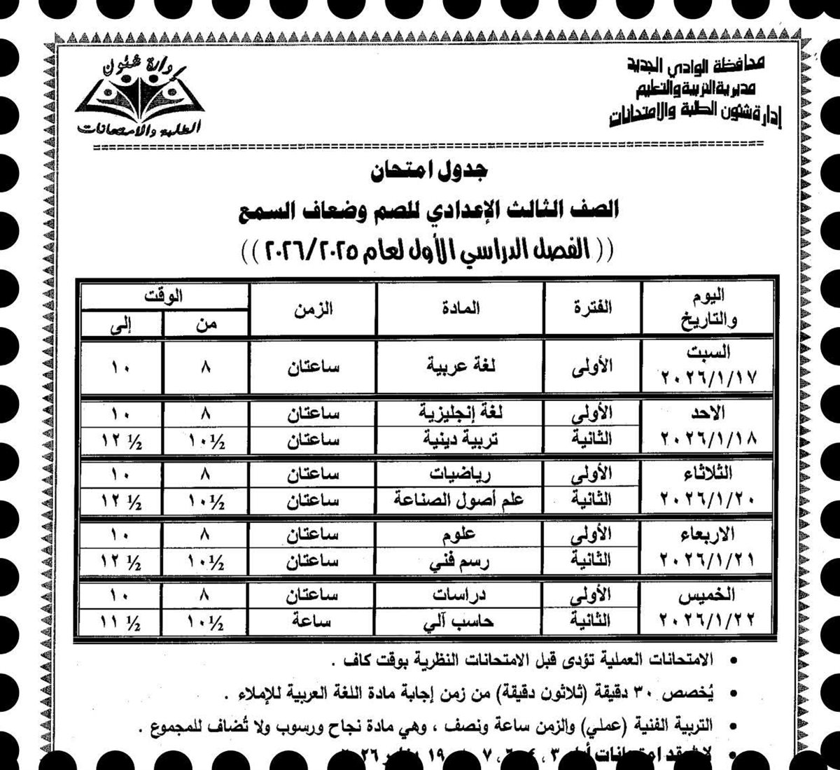 اعتمد اللواء دكتور محمد الزملوط محافظ الوادى الجديد، جداول امتحانات الفصل الدراسي الأول للعام الدراسي ٢٠٢٥/ ٢٠٢٦م، وذلك لصفوف النقل بالمرحلة الابتدائية والإعدادية والمدارس الفنية (تجاري - زراعي -صناعي - التعليم المزدوج ) ومنظومة الفصل الواحد، ومدارس الأمل للصم وضعاف السمع، وكذا الشهادة العامة الإعدادية للتعليم العام واللغات والمهنية والرياضية والدمج ومدارس التربية الخاصة، وذلك بجميع الإدارات التعليمية الخمس، مع مراعاة عدم عقد أية امتحانات أيام أعياد الأخوة الأقباط خلال شهر يناير القادم.