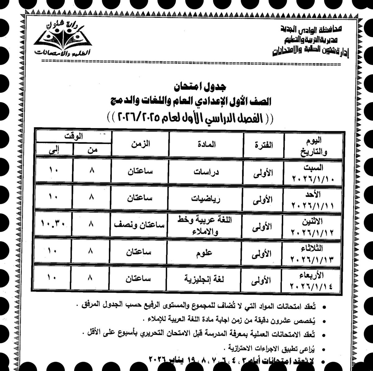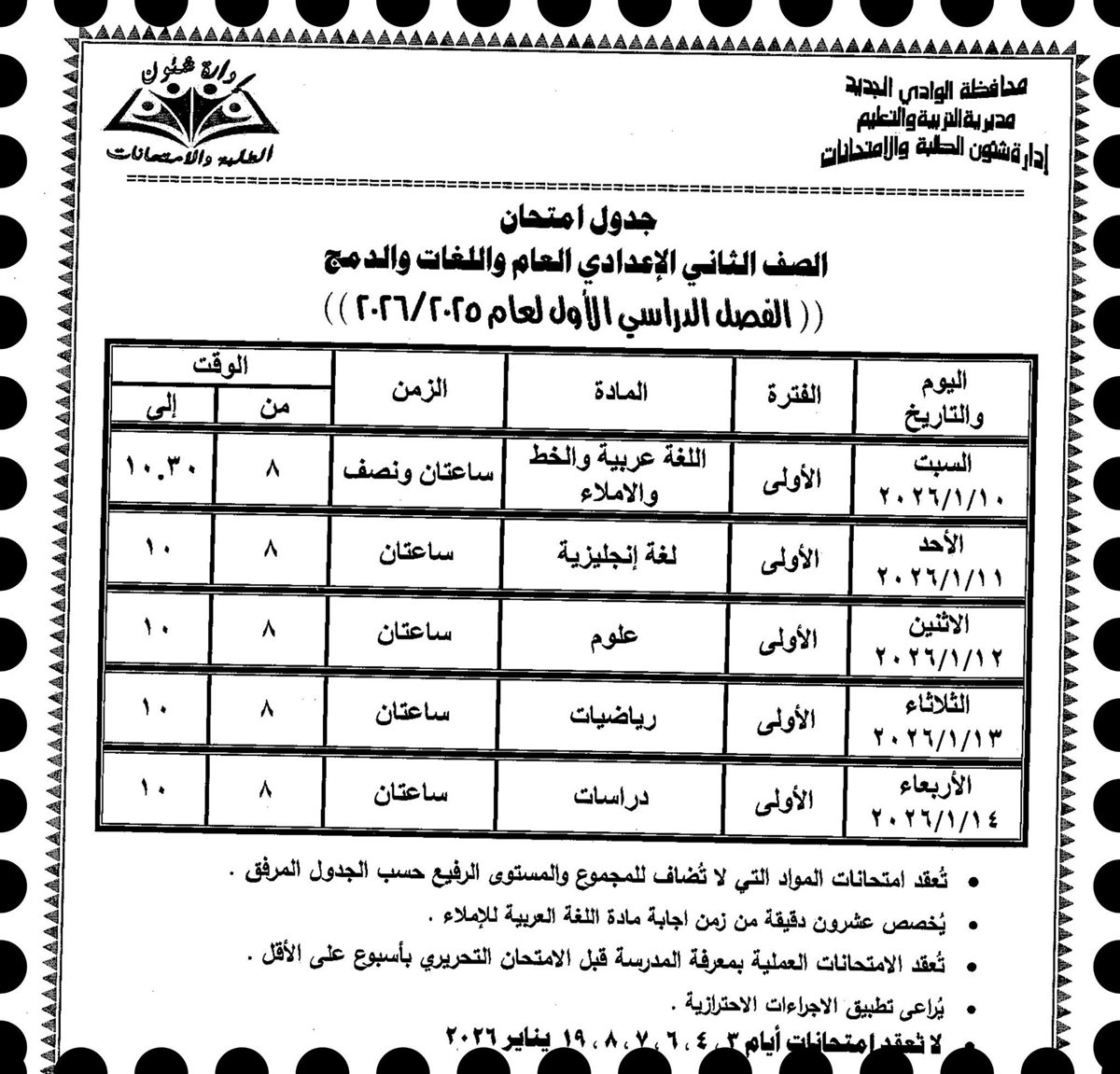 حيث تنطلق امتحانات صفوف النقل اعتبارًا من يوم السبت الموافق ١٠ يناير ٢٠٢٦ م، على أن تبدأ امتحانات الشهادة الإعدادية العام واللغات والرياضية والدمج والمهنى اعتبارًا من يوم الخميس الموافق ١٥ يناير ٢٠٢٦ وتستمر حتى الخميس الموافق ٢٢ من نفس الشهر.