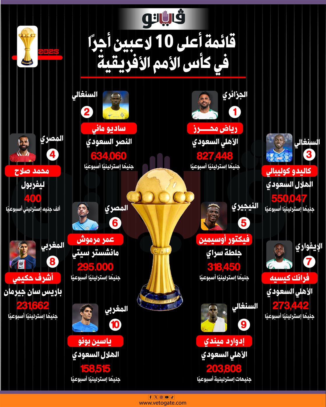قائمة أعلى 10 لاعبين أجرًا في كأس الأمم الأفريقية (انفوجراف)