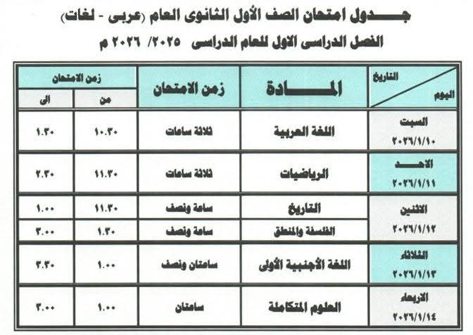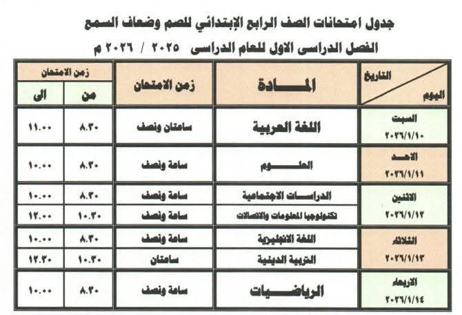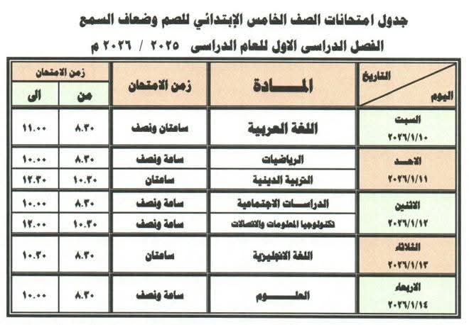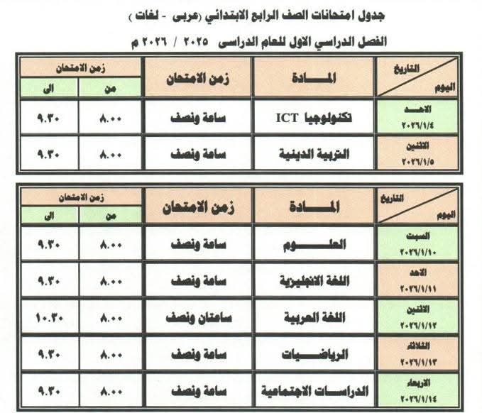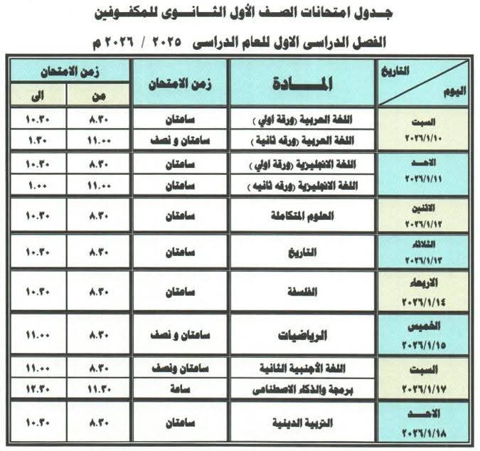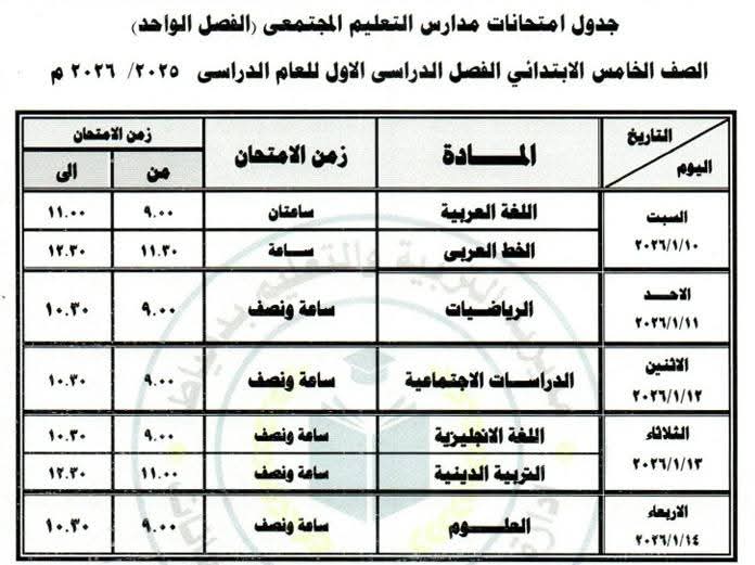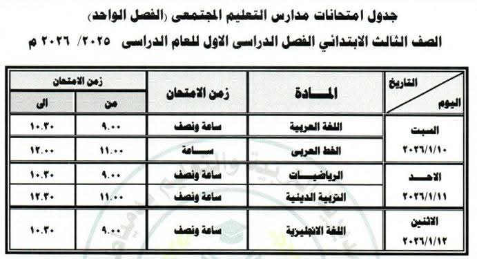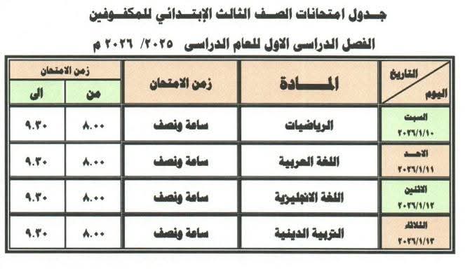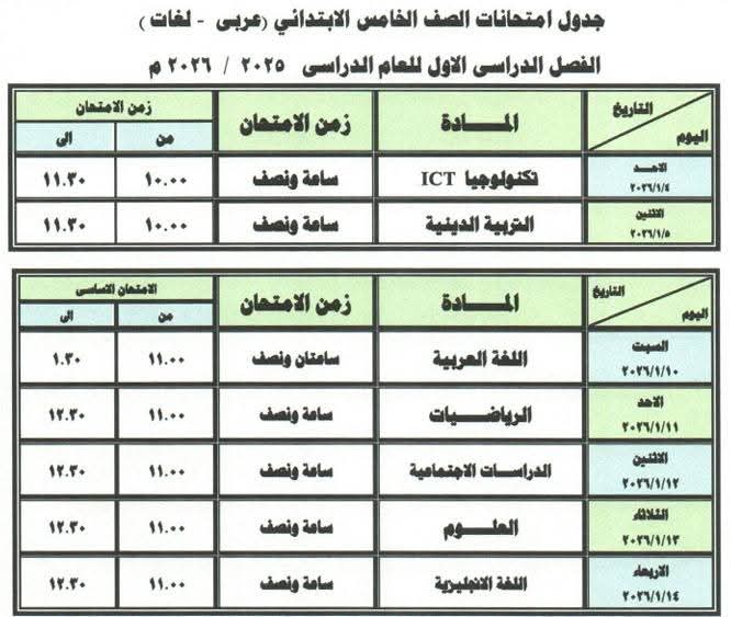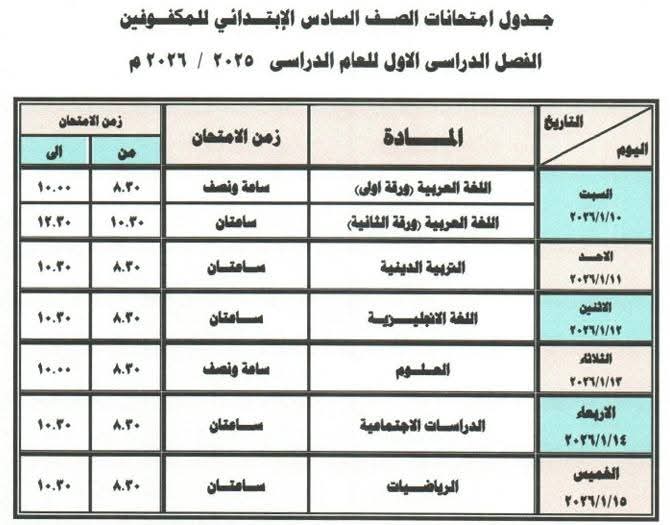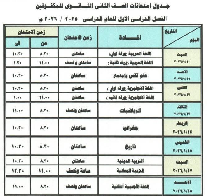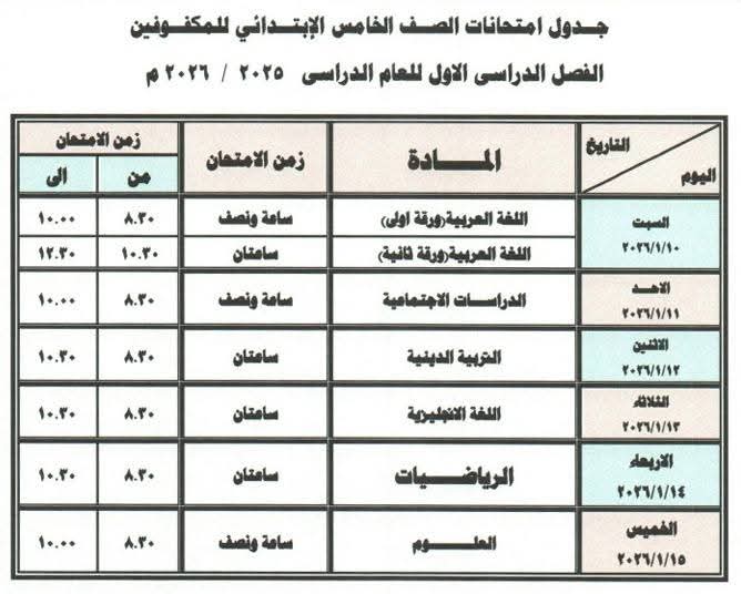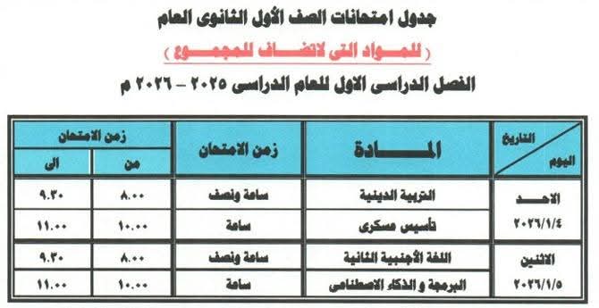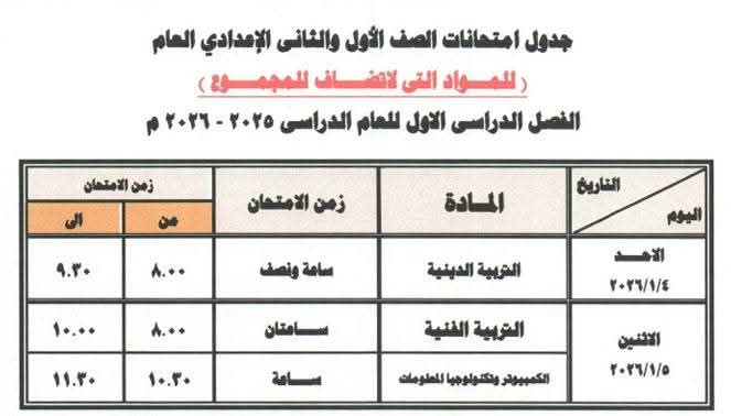 مواعيد امتحانات المواد غير المضافة للمجموع والمقرر عقدها يومي 4 و5 يناير المقبل، على ان تبدأ امتحانات المواد الاساسية للتعليم العام اعتبارا من يوم 10 يناير 2026، وفق جدول زمني يراعي التوازن بين المواد الدراسية.