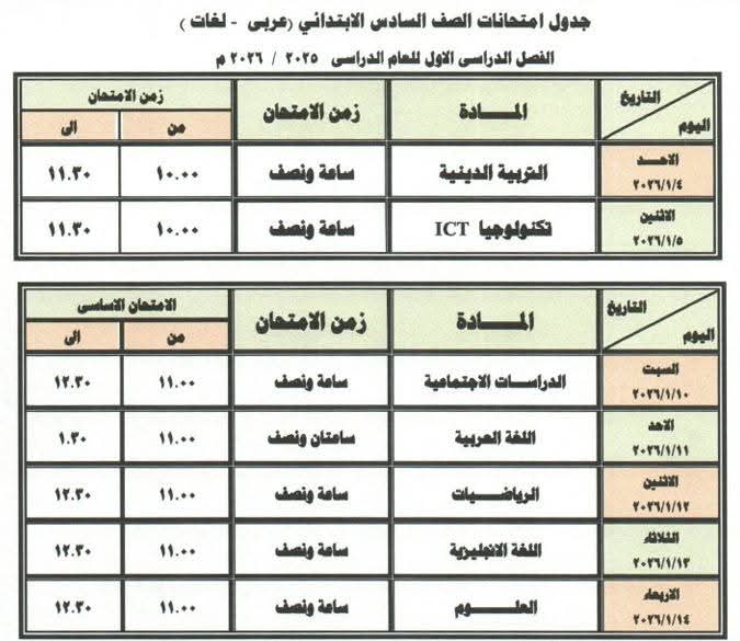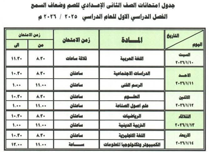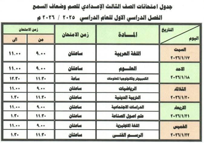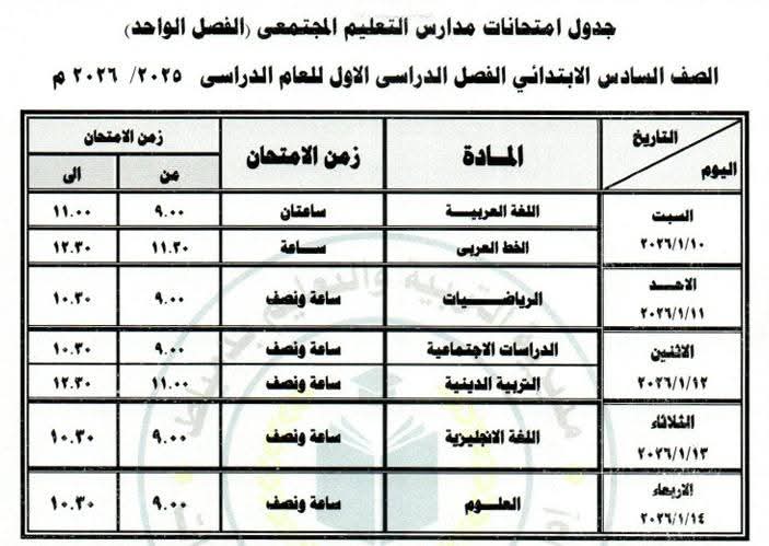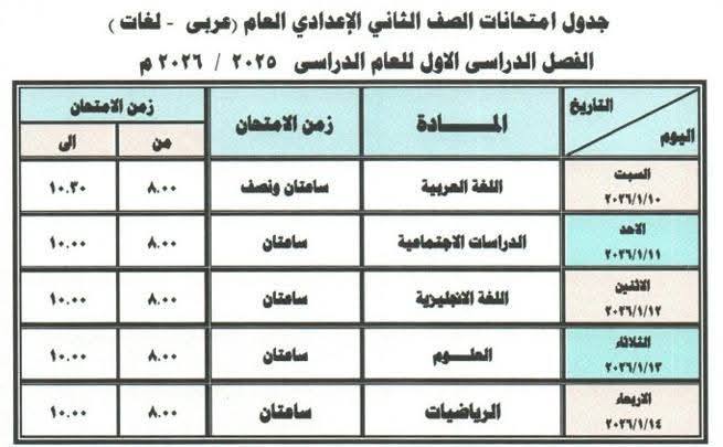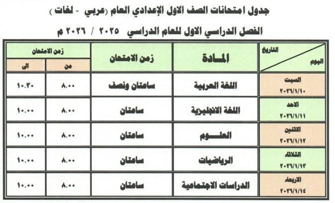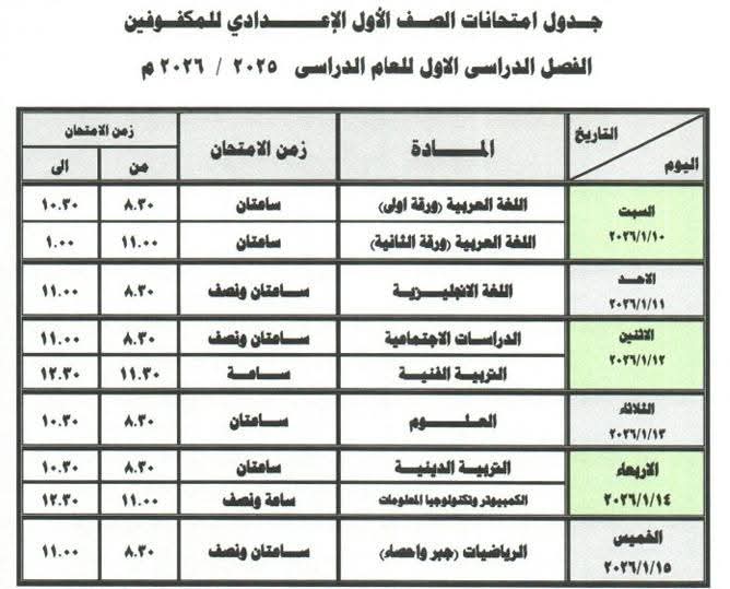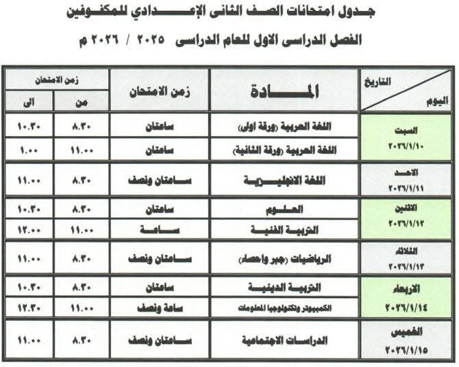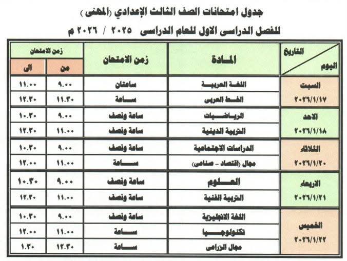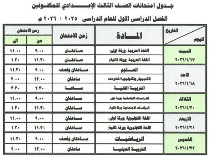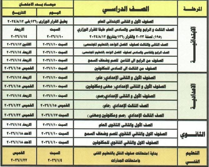 فيما تقرر ان يؤدي طلاب الشهادة الإعدادية امتحانات المواد غير المضافة للمجموع يوم 15 يناير 2026، على أن تبدأ امتحانات المواد الأساسية اعتبارا من يوم 17 يناير 2026، وسط استعدادات مكثفة لضمان حسن سير الامتحانات.