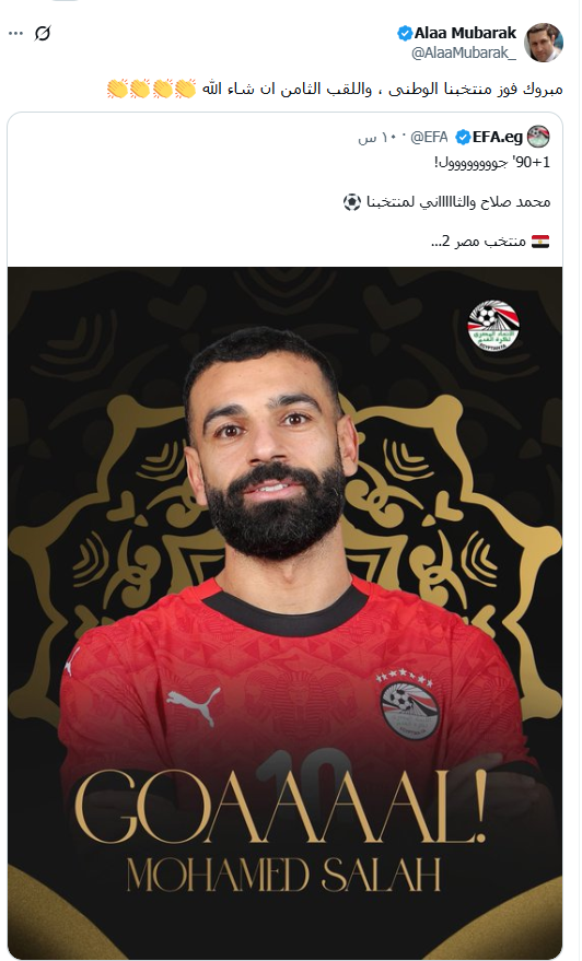 في البداية علق علاء مبارك، في تغريدة عبر منصة "أكس"، عن سعادته لفوز منتخب مصر على منتخب زيمبابوي، في بطولة كأس الأمم الإفريقية، فقال: " مبروك فوز منتخبنا الوطنى، واللقب الثامن إن شاء الله"