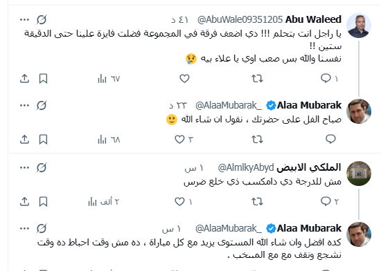 وعلق علاء مبارك فقال: "كده أفضل وإن شاء الله المستوى يزيد مع كل مباراة، ده مش وقت إحباط ده وقت نشجع ونقف مع المنتخب".