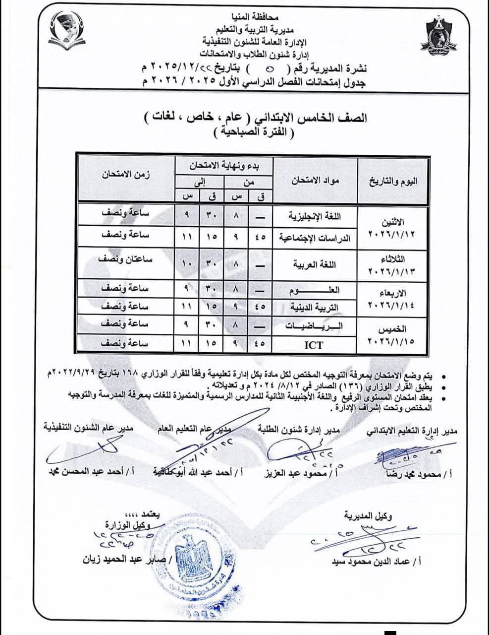 جدول امتحانات الصف الخامس الابتدائي في المنيا