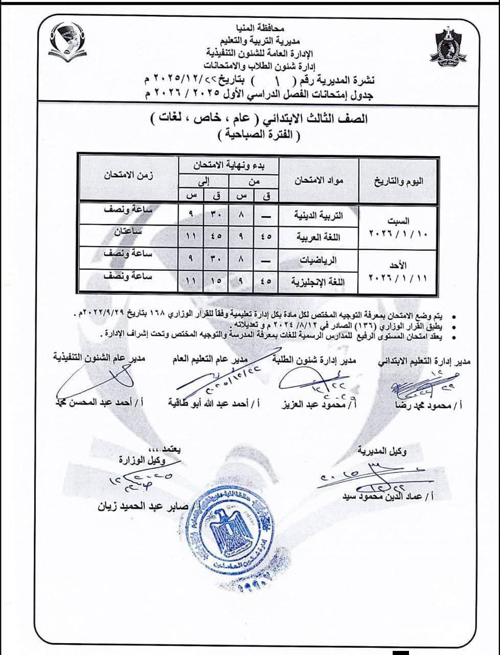 جدول امتحانات الصف الثالث الابتدائي في المنيا