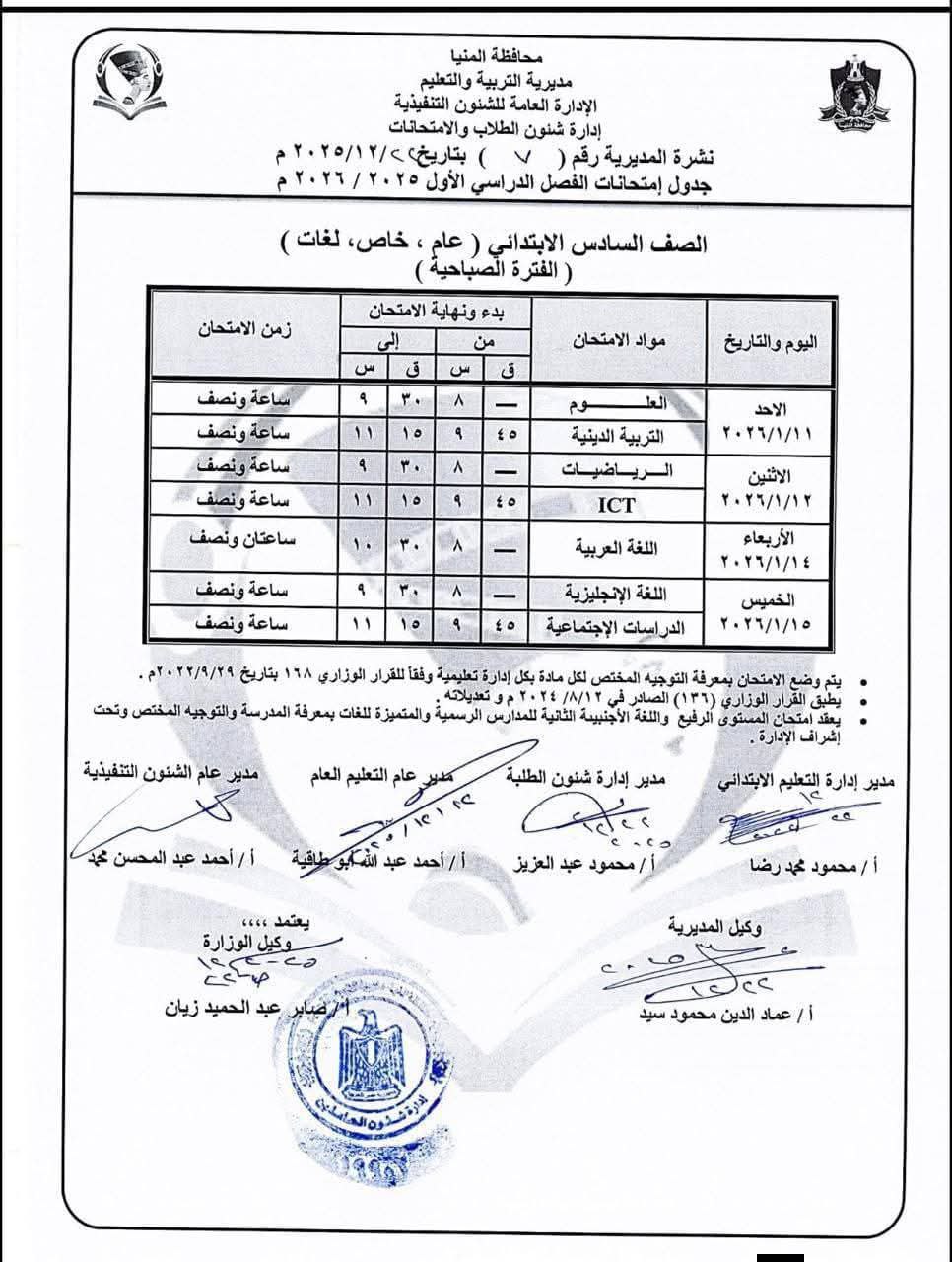 جدول امتحانات الصف السادس الابتدائي في المنيا