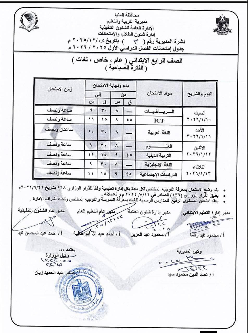 جدول امتحانات الصف الرابع الابتدائي في المنيا