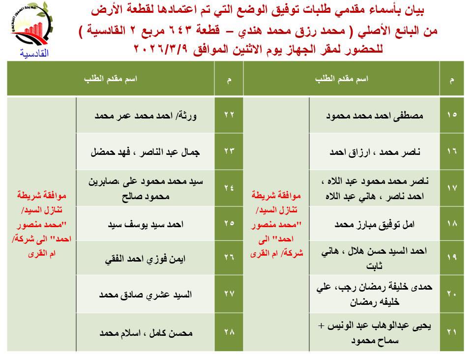 كشفت وزارة الإسكان والمرافق والمجتمعات العمرانية عن تقنين دفعة جديدة من أراضي المواطنين بمنطقة ك 48 سابقًا شركة الاتحاد العربي عقد 400 فدان بمدينة العبور الجديدة، الذين تم اعتماد توفيق أوضاع أراضيهم لاستكمال إجراءات التقنين.