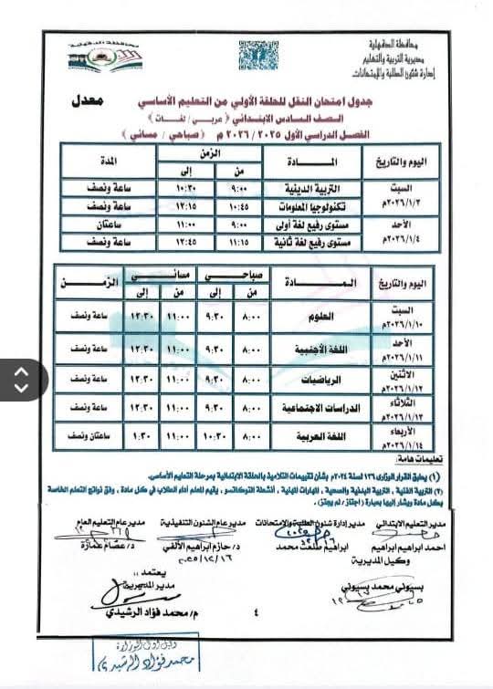 وأوضحت المديرية أن امتحانات مدارس المكفوفين والصم وضعاف السمع تُجرى وفق ذات المواعيد المعتمدة لكل مرحلة، حيث تبدأ امتحانات الصفين الأول والثاني الإعدادي في الفترة من 10 حتى 14 يناير، بينما تُعقد امتحانات الصف الثالث الإعدادي من 15 حتى 22 يناير 2026.