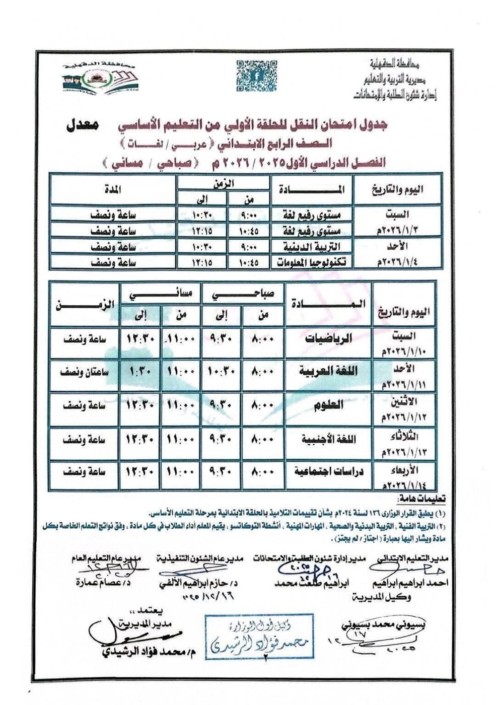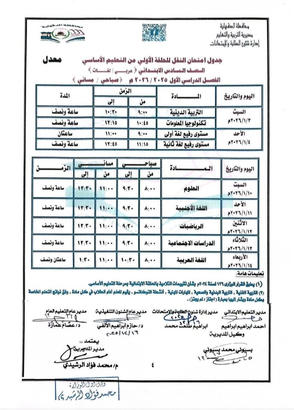 واشارت الي أن امتحانات الصفين الأول والثاني الإعدادي ستبدأ في الفترة من 10 حتى 14 يناير 2026، بينما تنطلق امتحانات الشهادة الإعدادية اعتبارًا من 15 يناير وتستمر حتى 22 يناير 2026.