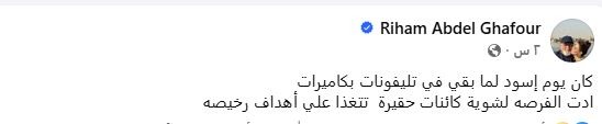 وقالت الفنانة ريهام عبد الغفور على صفحتها بـ"فيس بوك":" كان يوم أسود لما بقى في تليفونات بكاميرات.. أدت الفرصة لشوية كائنات حقيرة تتغذى على أهداف رخيصة".