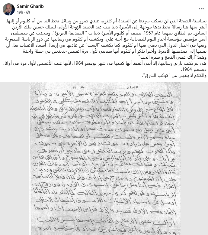 وتابع سمير غريب: "أنشر منها هنا رسالة بخط يدها موجهة إلى الأميرة دينا بنت عبد الحميد الزوجة الأولى للملك حسين بن عبد الله ملك الأردن السابق. تم الطلاق بينهما عام 1957. تصف أم كلثوم الأميرة دينا بـ " الصديقة العزيزة". وتتحدث عن مصطفى أمين مؤسس مؤسسة أخبار اليوم للصحافة مع أخيه علي".