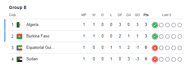 أمم أفريقيا، ترتيب المجموعة الخامسة بختام الجولة الأولى